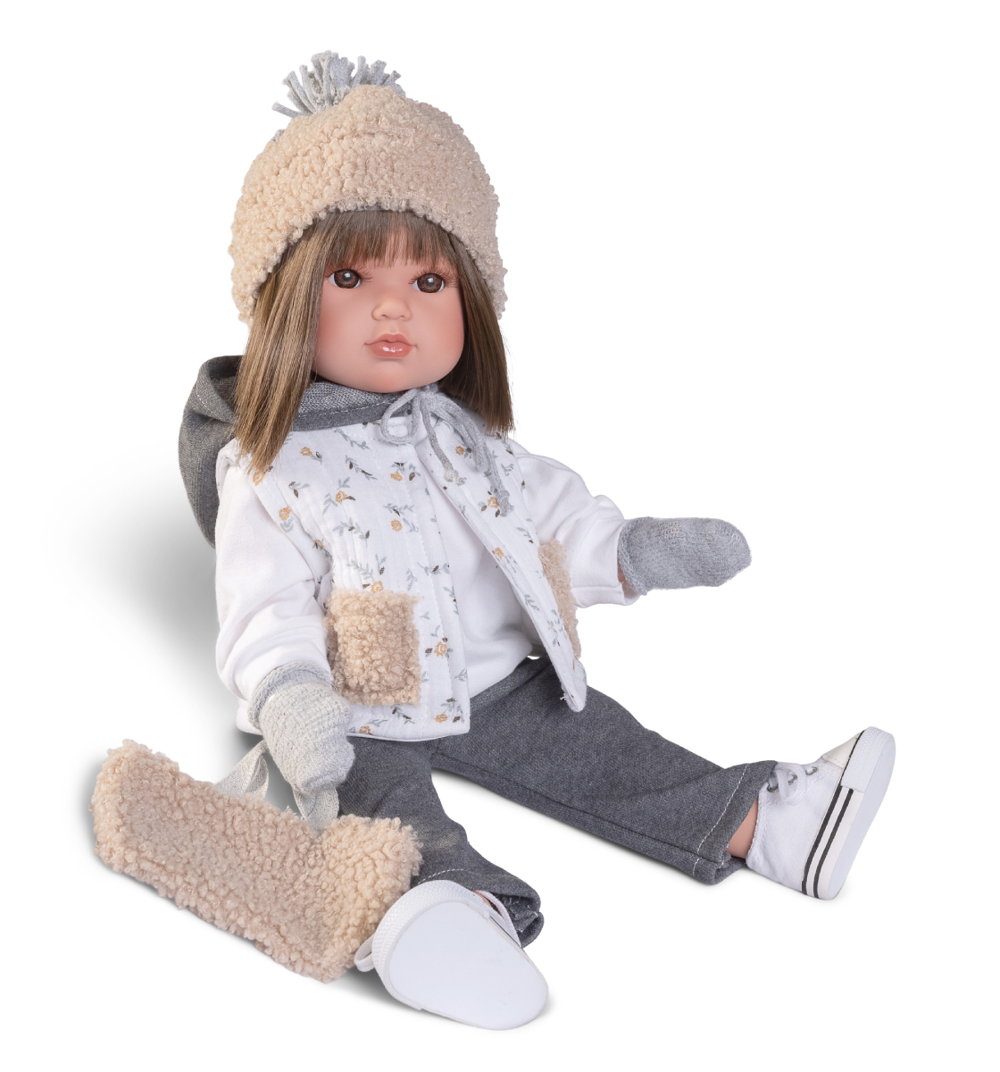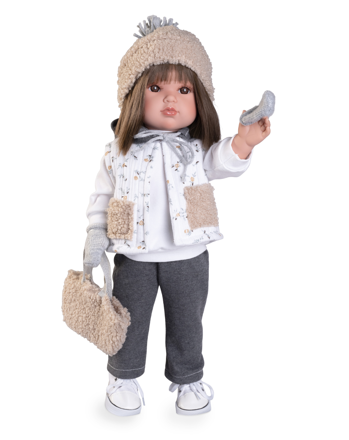 Winylowe lalki hiszpańskie o imieniu Bella mają wiele miłośniczek na całym świecie. Oprócz ruchomych kończyn i głowy posiadają głowę, którą można kręcić zarówno w płaszczyźnie poziomej jak i w pionowej. Model 28329 to śliczna brunetka o prostych, lśniących włosach i brązowych oczach, opatrzonych długimi rzęsami i ręcznie malowanymi brwiami. Lśniące usta i rumieńce na policzkach dodają lali uroku. Zachwyca też modny outfit, uszyty z najwyższej jakości tkanin: