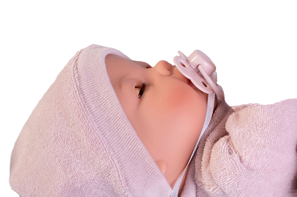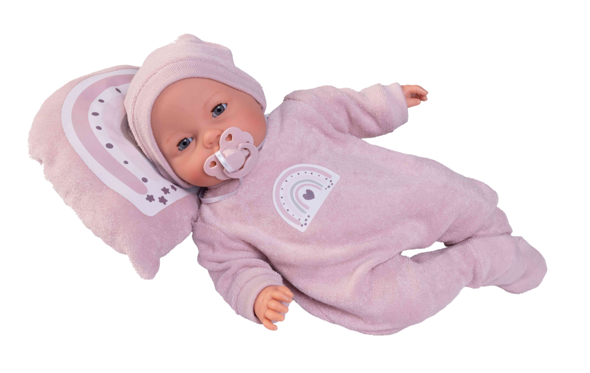 Bimba ma na sobie wsuwaną welurową czapeczkę i śpioszki z przyszytą na środku aplikacją w postaci tęczy. Ubranko ma umieszczone z tyłu zapięcie na rzep. Dopełnieniem zestawu będzie mięciutka poduszeczka i smoczek, który świetnie pasuje do buzi dziewczynki. Dzięki dołączonej tasiemki do smoczka dane akcesorium będzie zawsze przy lalce. Cały komplet idealnie pasuje do mięciutkiej lali.