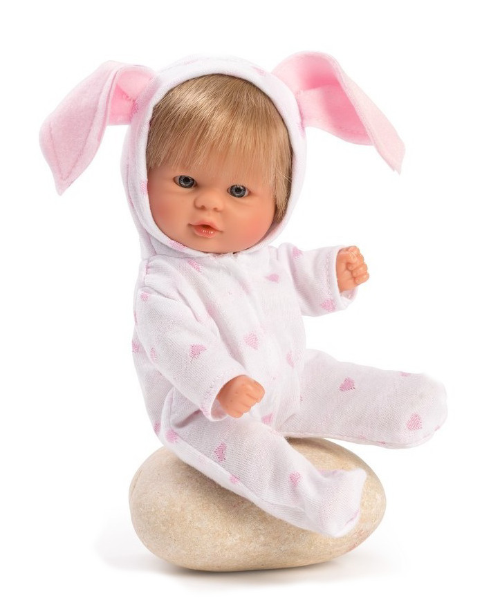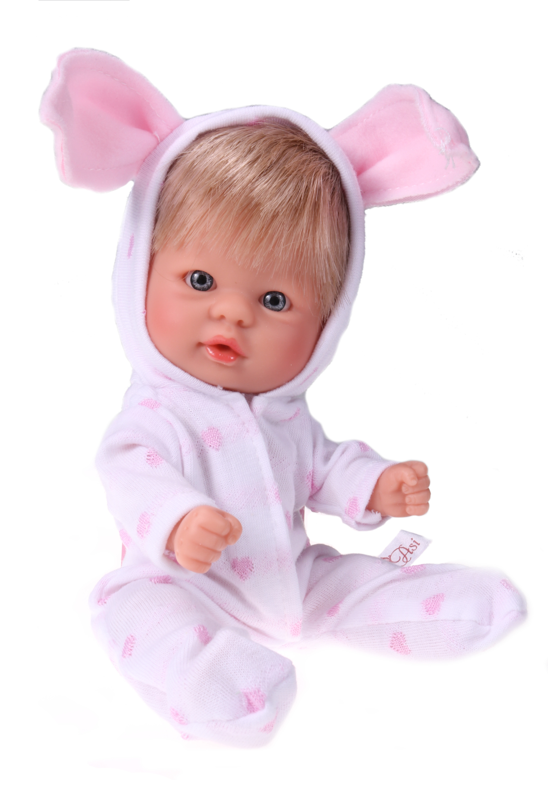 Lalka o imieniu Bomboncin od firmy Asi 0119957 to słodki bobas o wysokości 20 cm, który ma blond włoski z grzywką. Dziewczynka ma błękitny kolor oczu, oczka nie zamykają. Hiszpańska lalka w ubranku króliczka spodoba się miłośniczkom zabawy w dom i odgrywanie scenek.