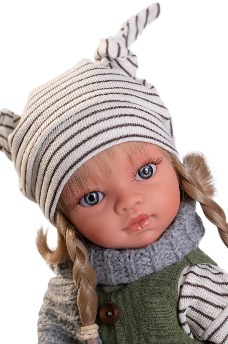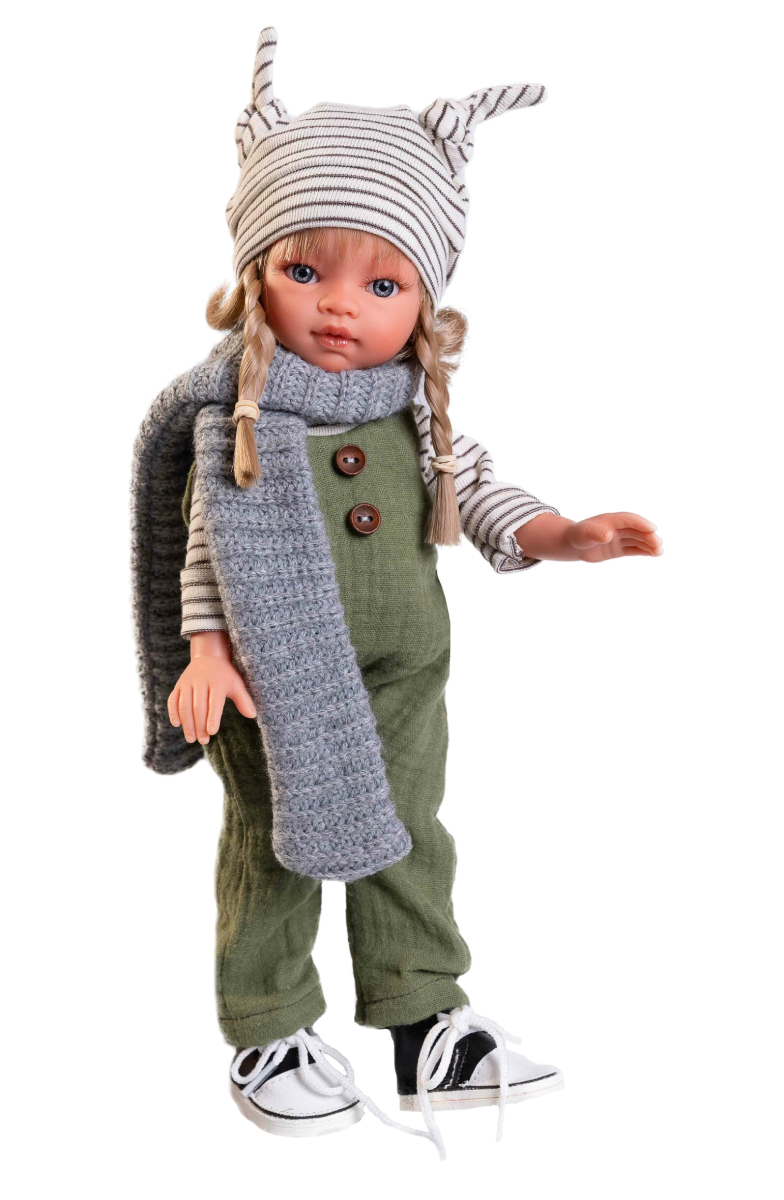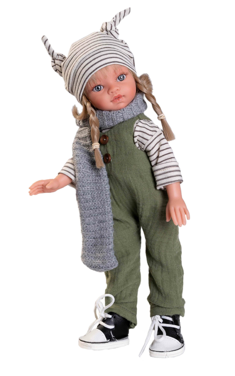 Emily ma na sobie zielone ogrodniczki na szelkach i białą bluzkę w drobne paski. Dodatkowego szyku stylizacji doda szary, wełniany szalik i biała pasiasta czapka. Ogrodniczki wykonano z materiału muślinowego, a na środek przyszyto dwa brązowe guziczki. Dodatkowo na drobnych nóżkach lala ma założone dłuższe wiązane trampki. Sportowe obuwie będzie pasowało do każdego ubioru. Ubrania Emily Boho wykonano z organicznych tkanin, a to oznacza, że w procesie ich uprawy i produkcji nie użyto żadnych środków chemicznych tylko naturalne.