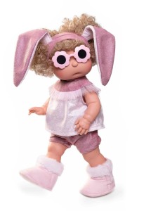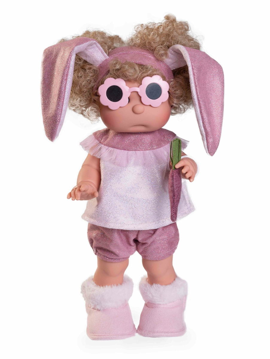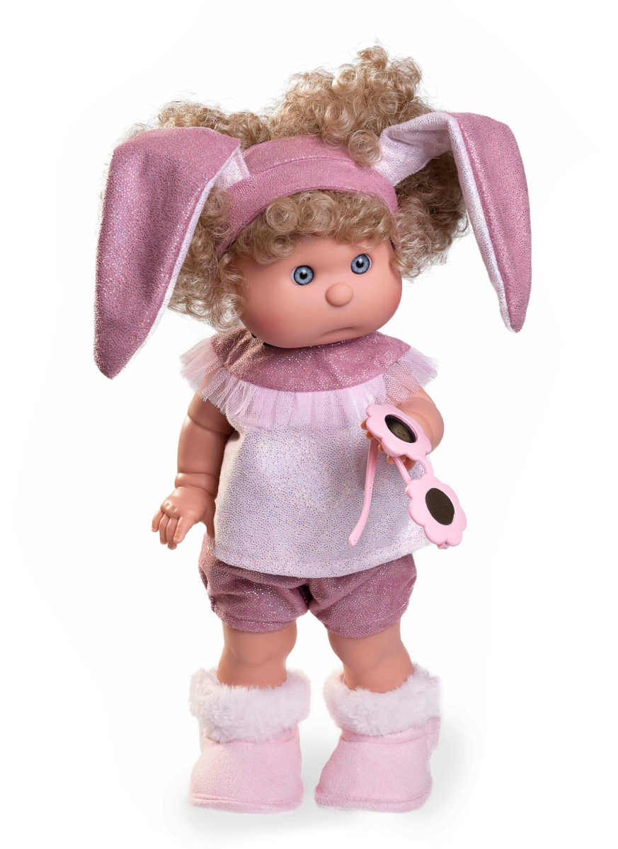 Zachwyca słodka buzia z rumianymi policzkami, okrągłym noskiem, niebieskimi oczkami i jasnoróżowymi usteczkami. Mięciutkie, kręcone blond włosy zostały zebrane za pomocą uroczej, lśniącej, różowej opaski z długimi, brokatowymi uszkami.