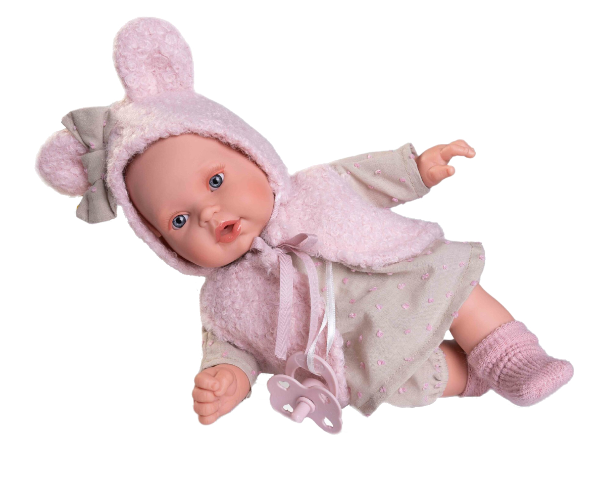 Dziewczynka ma na sobie szarą sukieneczkę, która jest na długi rękaw oraz bufiaste spodenki na gumce w tej samej tonacji co kreacja. Ubranko ozdobiono różowym nakrapianym wzorem. Strój uzupełnią dołączone dodatki: wełniane skarpetki i różowa czapeczka z uszkami misia z przyszytą kokardą. Dodatkowo dziewczynka ma na sobie różową kamizelkę z przyjemnego w dotyku materiału, a w buzi ma umieszczony smoczek, który jest na tasiemce. Za sprawą dołączonych dodatków zabawa nie będzie miała końca, a młoda posiadaczka dzięki kompletowi ubranek będzie miała większą możliwość w przebieraniu lali i tworzeniu własnych stylizacji. Dzięki takiemu wyposażeniu każda z dziewczynek będzie zadowolona z zabawy, a wszystko dzięki dodatkom, o które zadbał producent marki Antonio Juan.