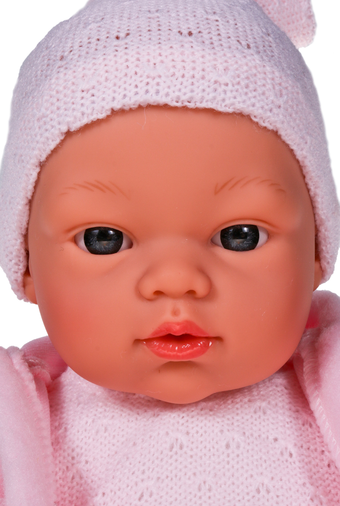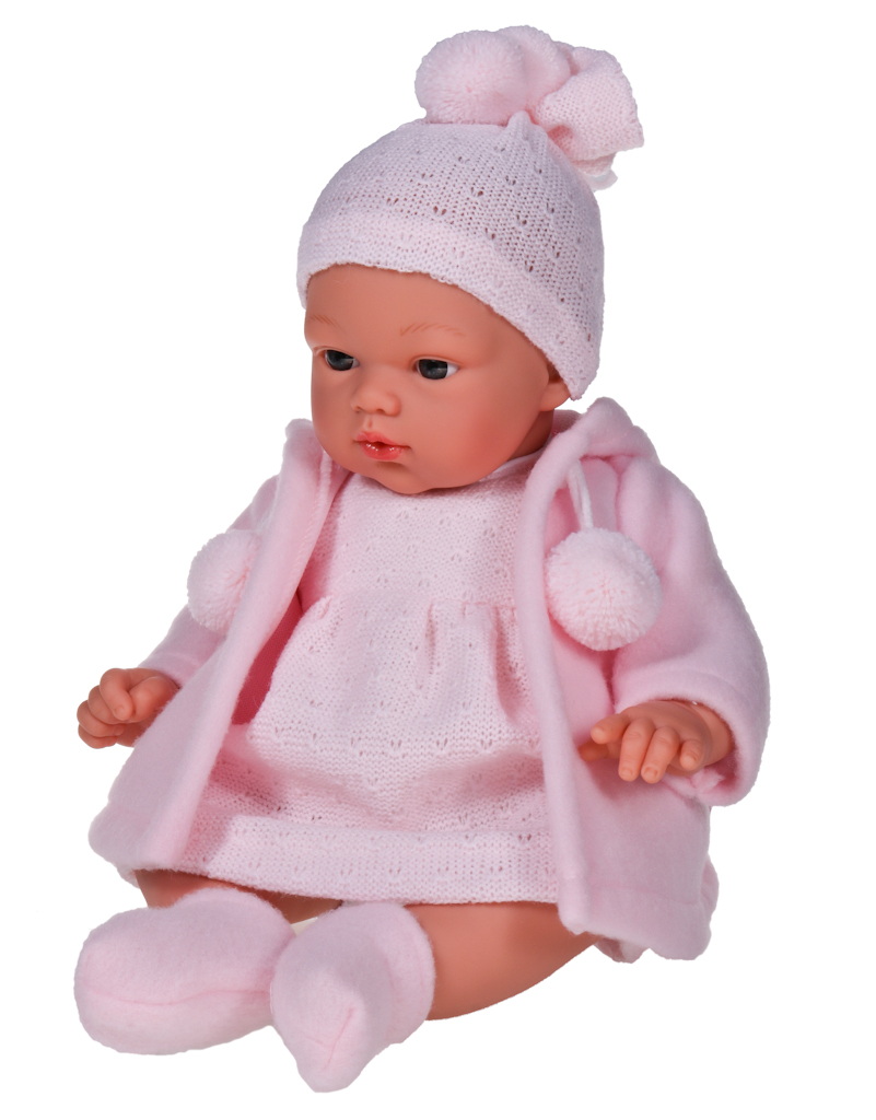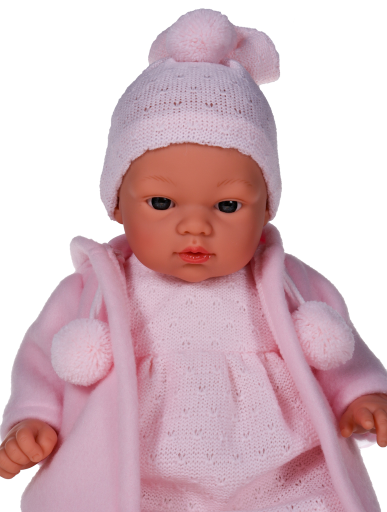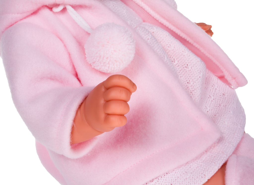 Noworodek ubrany jest w różową sukienkę z dzianiny oraz polarową kurtkę z kapturem w tym samym kolorze. Płaszczyk jest zawiązywany pod brodą na sznurek ozdobiony pomponami. Ubranie przyda się do otulenia lali szczególnie w chłodniejsze dni. Stroju dodaje wyjątkowego uroku różowa czapka z małymi pomponami na środku oraz polarowe skarpetki. Teraz nasza pociecha może rozbierać i ubierać lalę bez końca, co pomoże przy nabraniu wprawy w codziennym obowiązku przebierania.