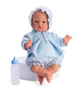 Bobasa bez włosów ubrano w uroczą niebieską stylizację. Góra ubranka to ciepła bluzka z długim rękawkiem. Ubranku dodatkowej elegancji doda wszyta niewielka kwiecista wstawka. Natomiast dół ubioru to bufiaste spodenki z kwiecistym wzornictwem. Ubranko jest zapinane na rzepę co ułatwi dziecku zdejmowanie stroju, a zabawa w przebieranie stanie się jeszcze ciekawsza. Strój uzupełni niebieska czapka wiązana pod brodą na kokardkę, a ponadto udekorowana falbanką w kwiaty. Koke można przebierać bez końca, przytulać oraz zabierać ze sobą na drzemkę. Więcej możliwości zapewni dołączona do zestawu butelka. Pojemnik odkręca się i można napełnić go wodą.