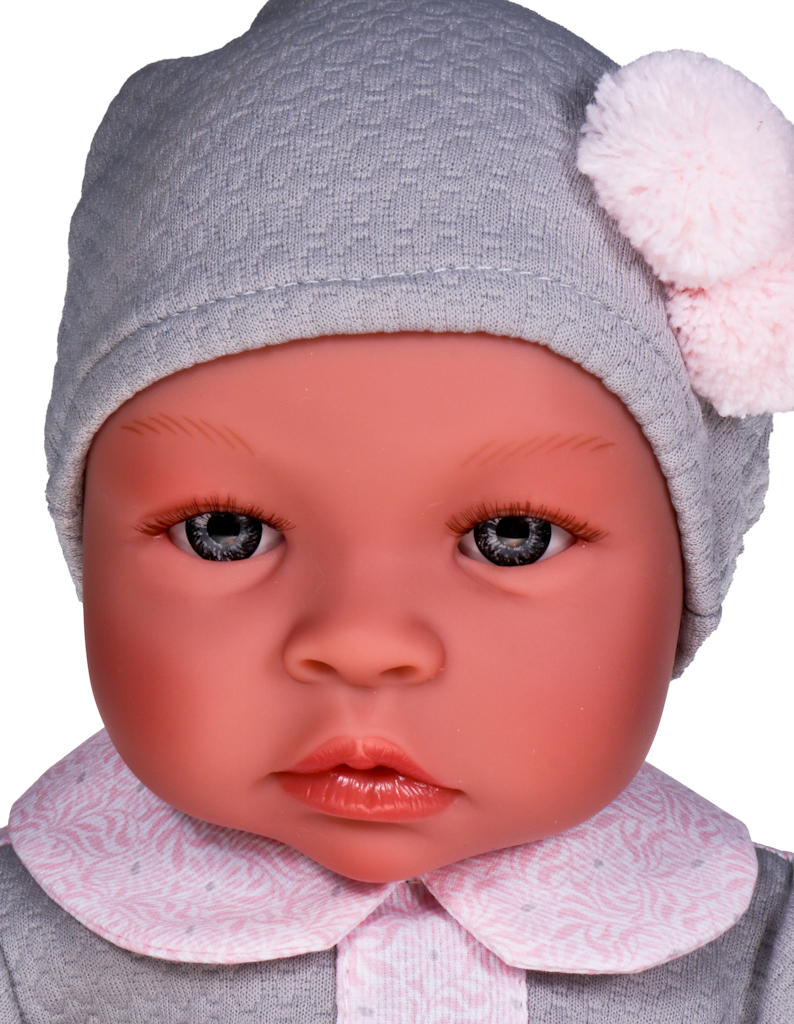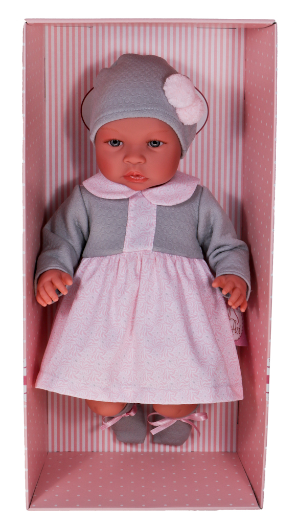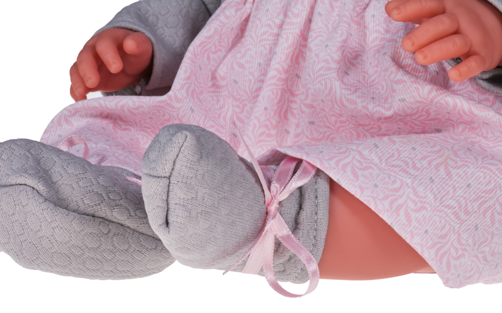 Wyjątkowa kreacja sprawia, że nasza pociecha bez problemu może zabrać ze sobą lalę na rodzinny obiad, przyjęcie urodzinowe czy spacer do parku. Noworodek ubrany jest w szaro-różową sukienkę z długim rękawkiem zapinaną na rzepę. Elegancji dodaje jej kołnierzyk w kolorze i kroju w szlaczek, taki jak dolna część ubrania. Strój uzupełnia szara czapka z różowym pomponem, a także bielizna - bufiaste majtki i skarpetki z różowymi kokardami. Ubrania dziewczynki można zdjąć, aby umilić zabawę i nabrać wprawy w przebieraniu pociechy. Dziecko może poczuć się jak prawdziwa mama troszcząca się o malucha.