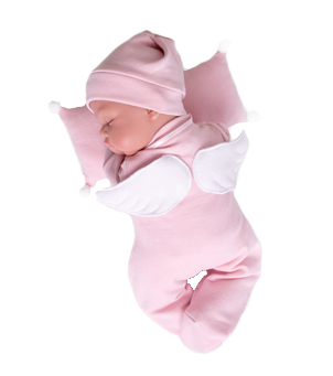 Dziewczynka ma na sobie urocze różowe piżamki do których z tyłu przyszyto skrzydełka aniołka. Ubranko zapinane jest z przodu na rzep. Dopełnieniem zestawu będzie wsuwana czapeczka świetnie pasująca do całej stylizacji. Ponadto zestaw wyposażono w smoczek na tasiemce oraz poduszeczkę zakończoną pluszowymi pomponikami.