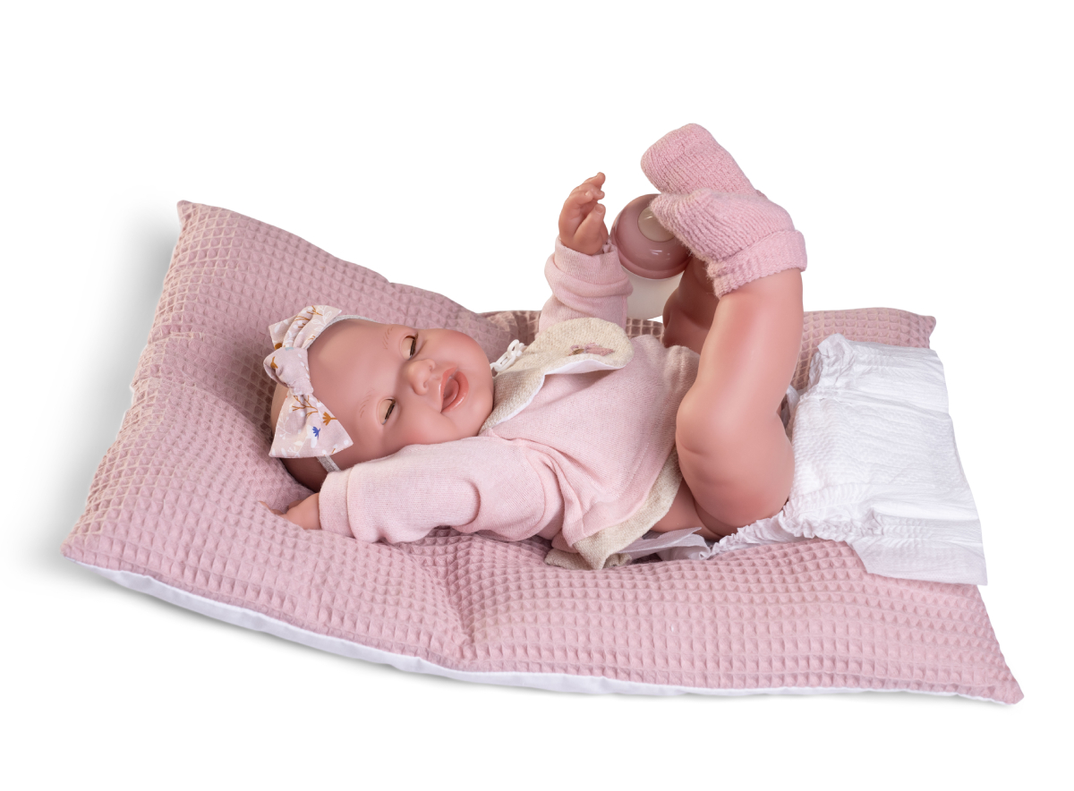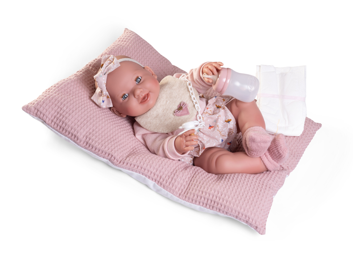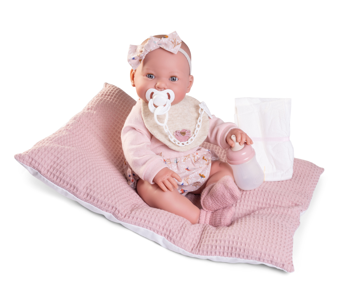 W komplecie z siusiającą lalką hiszpańską znajdują się atrakcyjne akcesoria: wygodna poduszka w pikowany wzór, butelka, 2 pieluszki, smoczek na łańcuszku z klipsem w kształcie główki misia.