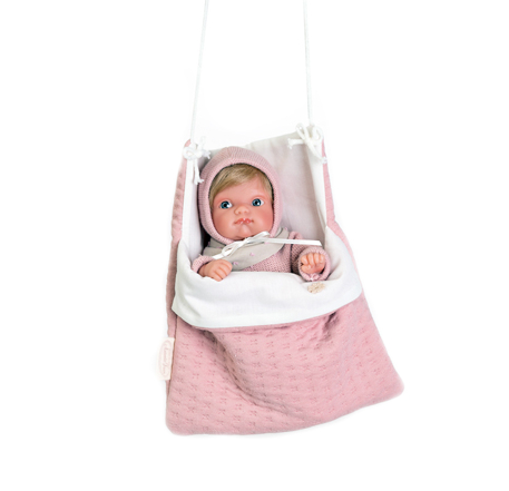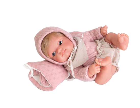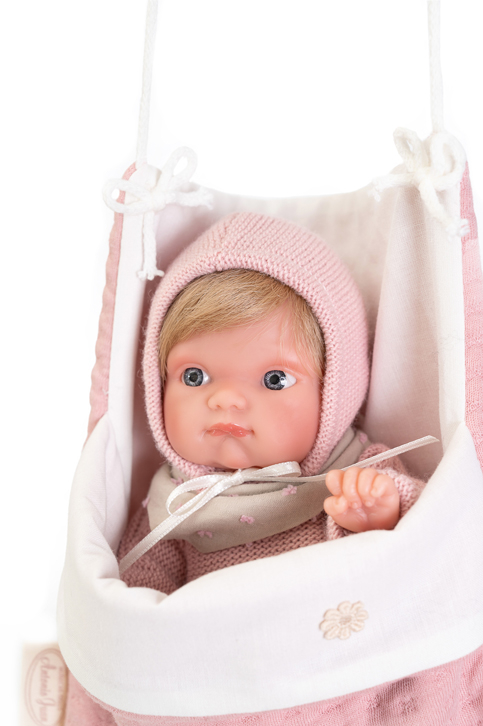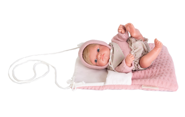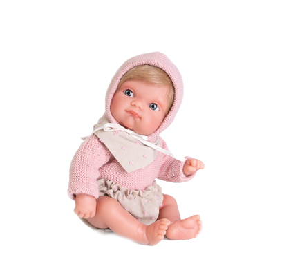 Mała, urocza Mufly 85211 o wysokości 21 cm z torebką na ramię w zestawie, idealnie wypsaża asortyment oferowanych lal hiszpańskiej marki Antonio Juan. Laleczka jest niewielka i waży 230 g idealnie pasuje do drobnych rączek. Niemowlak ma zaznaczoną płeć jak prawdziwe dziecko i jest to dziewczynka. Lalka w całości wykonana została z bardzo miękkiego i przyjemnego w dotyku winylu, który nadaje się do kąpieli. Mufly ma również kótkie blond włosy doskonale nadające się do czesania.