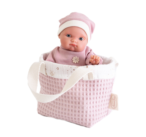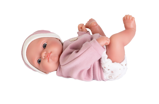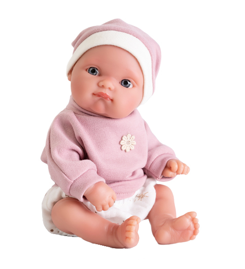 Bobas Mufly w biało-różowej stylizacji 85212 o wysokości 21 cm świetnie poszerza asortyment tych najmniejszych lalek marki Antonio Juan. Drobna laleczka waży 230 g idealnie pasuje do drobnych rączek. Niemowlak ma zaznaczoną płeć jak prawdziwe dziecko i jest to dziewczynka. Lalka w całości wykonana została z bardzo miękkiego i przyjemnego w dotyku winylu, który nadaje się do kąpieli. Mufly nie posiada włosów, jedynie na jej główce zaznaczono rzeźbienia będące imitacją włosków niemowlęcych, a jej powierzchnię przyciemniono, aby bobas wygładał jak żywy.