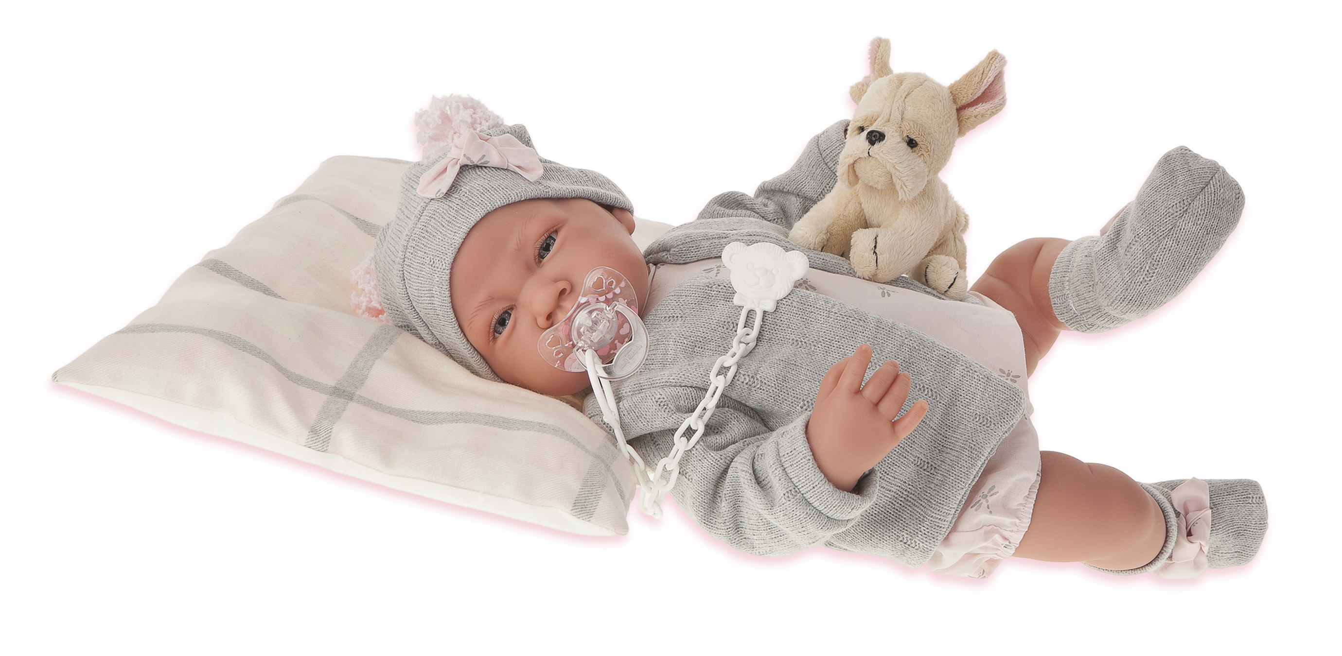 Nacida jest ubrana w jasnoróżowe śpioszki ozdobione drobnymi ważkami. Body zostały uszyte na szerokich ramiączkach i mają krótkie nogawki. Strój zapina się na rzepę, co ułatwia zdejmowanie ubranka, a zarazem umila zabawę. Lalka ma na wierzchu szary sweterek z dzianiny. Cieplejszy ciuszek przyda się szczególnie przy wyjściu na spacer lub zakupy. Strój uzupełniają dodatki w kolorze i wzorze sweterka, tj. skarpetki oraz wsuwana czapeczka z uszami. Oba dodatki zostały ozdobione przyszytą kokardką. Modne ubranka sprawiają, że Nacida jeszcze bardziej przypomina prawdziwego bobasa :) Wszystkie elementy kompletu można zdjąć, dzięki czemu nasza pociecha nabiera wprawy w przebieraniu i uczy się obowiązku, który w życiu codziennym często stanowi nie lada wyzwanie.