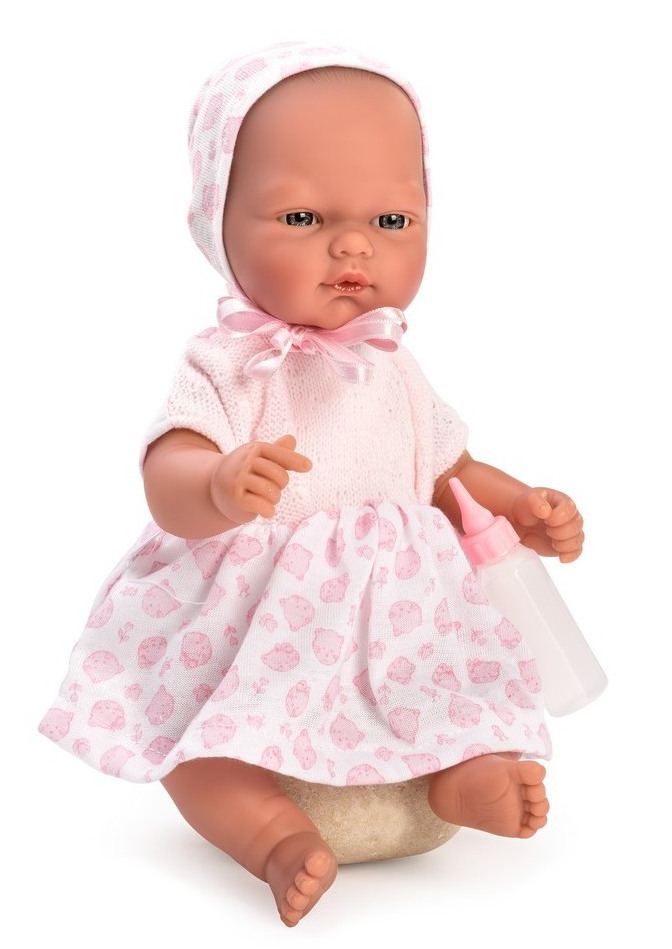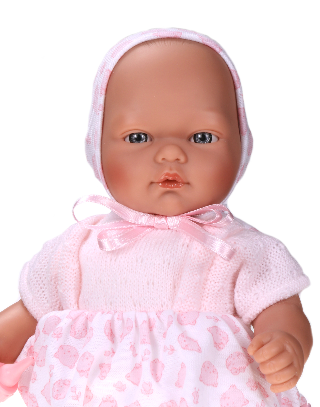 Noworodek ubrany jest w lekką, różową sukienkę zapinaną na rzepę. Góra jest wykonana z dzianiny, natomiast dół - biały, bawełniany we wzór w różowe buźki kotków. Ubranie uzupełniają białe, bufiaste majtki na gumce (bloomersy) oraz czapka we wzorek sukienki zawiązywana pod brodą na kokardkę. Nasza pociecha może zdjąć wszystkie ubrania lali, co umili zabawę oraz pozwoli jej nabrać wprawy przy codziennym obowiązku. Dziecko może troszczyć się o swoje maleństwo by poczuć się jak prawdziwa mama.