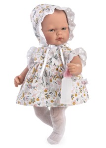 Noworodek ubrany jest w letnią, białą sukienkę zapinaną na rzep. Kreacje ozdobiono wzorem w kolorowe kwiaty, a zakończenia rękawków stanowi biała ażurowa koronka. Strój uzupełniają białe rajstopki oraz czapka. Biała czapeczka została wykonana z tego samego materiału i o tym samym wzorze co kreacja. W dodatku ozdobą są ażurowe wstawki oraz biała tasiemka przy pomocy której będziesz mógł zawiązać ją pod brodą. Dodatkowe wstawki oraz wszelkie elementy dekoracyjne sprawią, że w całości laleczka świetnie się komponuje. Nasza pociecha może zdjąć wszystkie ubrania lali, co umili zabawę oraz pozwoli jej nabrać wprawy przy codziennym obowiązku. Dziecko może troszczyć się o swoje maleństwo by poczuć się jak prawdziwa mama.
