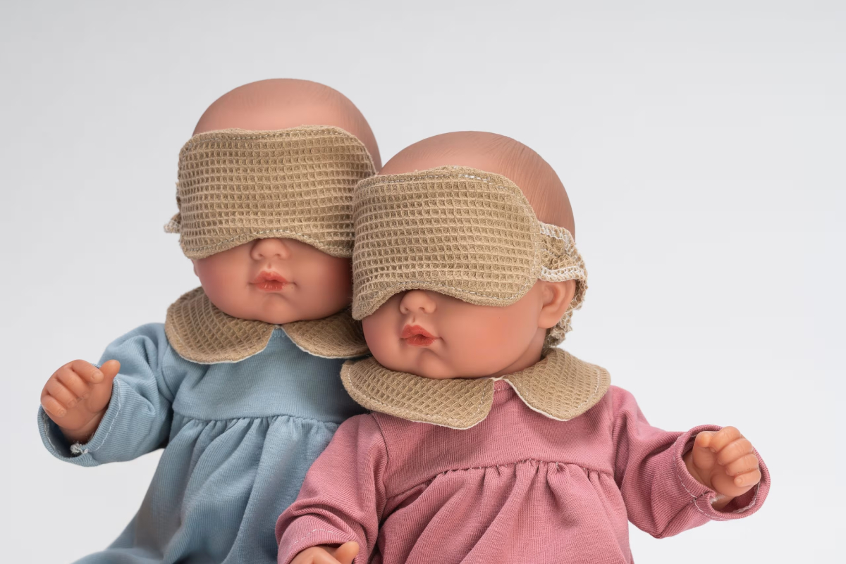 Lalka hiszpańska ubrana jest w różową dzianinową piżamkę z beżowym kołnierzykiem, uszytą ręcznie z wysokiej jakości miękkiej tkaniny. Zapięcie na rzep ułatwia dziecku przebieranie bobasa. Outfit uzupełnia opaska na oczy na elastycznej gumeczce.