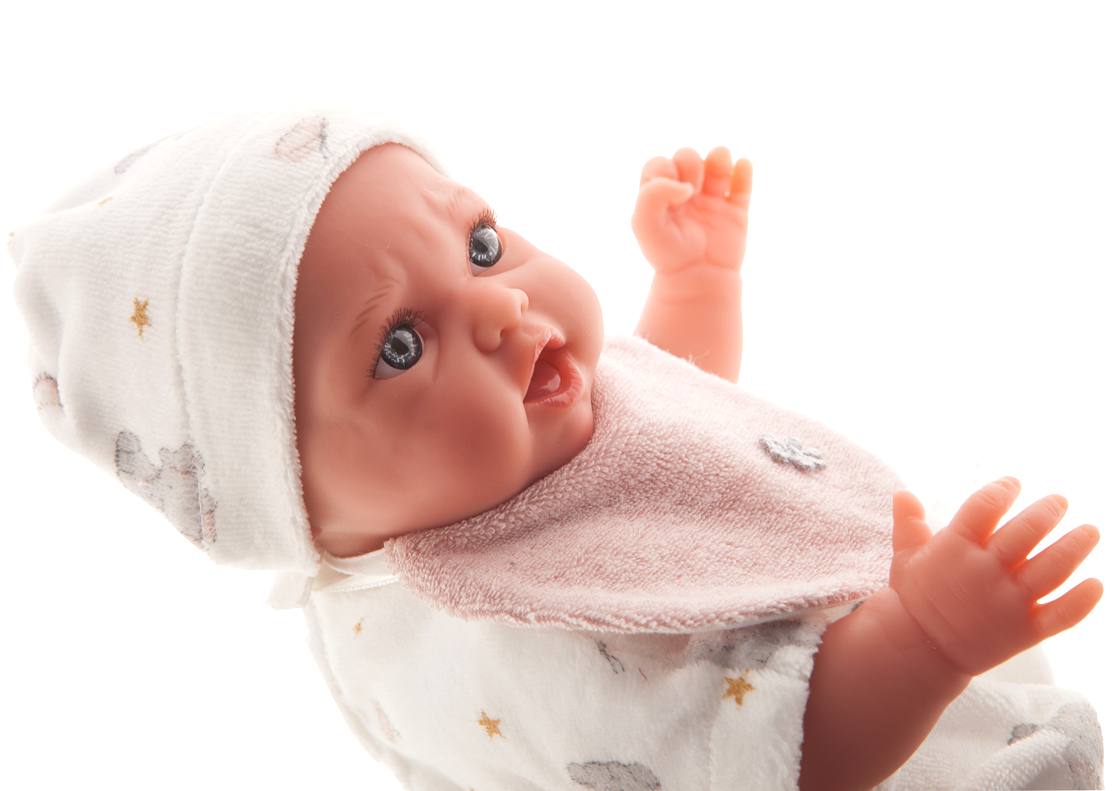 Dziewczynka o imieniu Pequi 17195 to kolejna z piękności oferowanych przez hiszpańską firmę, która zajmuje się przede wszystkim produkcją ręcznie wykonanych laleczek. Niewielki bobas ma 29 cm wysokości. Jest to całkowicie bezpieczny produkt dla Twojego dziecka, gdyż na główce ma jedynie rzeźbienia imitujące włoski noworodka. Dziewczynka ma ręcznie malowane niebieskie oczka, a ich oprawę stanowi delikatnie podkreślony zarys brwi oraz długie czarne rzęsy. Pequi ma uroczy nosek, zaróżowione policzki oraz pomalowane na różowo usta wszystkie te elementy sprawiają, że lala wygląda autentycznie.
