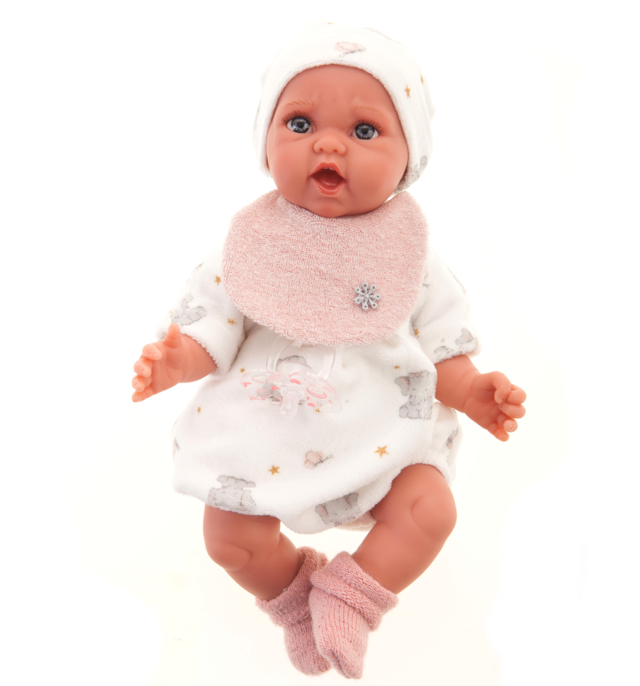 Dziewczynka ma na sobie krótkie body, które przy nóżkach zostały zakończone gumkami. Białe ubranko ozdobione wzorem w szare słonie i żółte gwiazdki. Elementami uzupełniającymi strój są różowe skarpetki wykonane z dzianiny i śliniaczek, do którego jako element dekoracyjny przyszyto szary kwiatuszek. Dzięki dodatkowemu akcesorium takim jak smoczek młoda mama może otulić grymaszącego bobasa do snu. Dodatkowo główkę Pequi zdobi wsuwana biała czapeczka ozdobiona takim samym wzorem co body. Z tak gustownie ubraną lalą można wybrać się na spacer, do koleżanki czy pojechać na rodzinne przyjęcie.