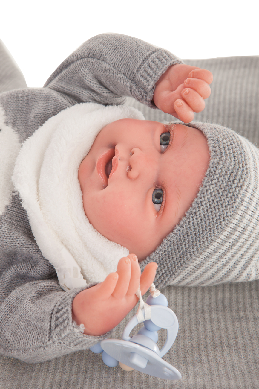 Noworodek ubrany jest w szary sweterek na długi rękaw, zapinany z tyłu na guziczek oraz rajstopki w białe paseczki. Dzianinową bluzeczkę zdobi umieszczona na środku uśmiechnięta biała chmurka. Strój uzupełnia komin, wsuwana czapka z przyszytym pomponem, a także pieluszka pampers. Wszystkie ubrania chłopca można zdjąć, dzięki czemu przebieranie pociechy umili zabawę. Ubieranie lalki pozwoli także naszej pociesze nabrać wprawy w codziennym obowiązku. Dziecko troszcząc się o swoje maleństwo, może poczuć się jak prawdziwa mama troszcząca się o swojego bobasa.