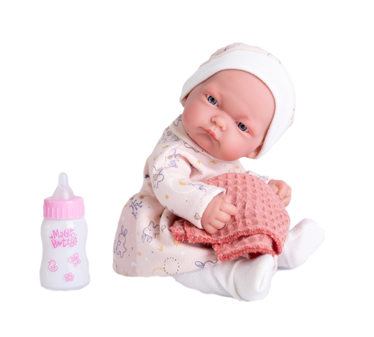 Bobasa ubrano w uroczą stylizację. Pitu ma na sobie białe półśpioszki i sukienkę odcinaną w talii. Kreacja jest na długi rękaw z motywem króliczków i posiada zapięcie na rzep. Dopełnieniem stylizacji jest brzoskiwniowa pikowana chusteczka i magiczna butelka z mleczkiem. Po przechyleniu, żeby napoić lalę mleko znika. Pitu rówież lubi się bawić chusteczką,a kiedy jest śpiąca przytulą ją, aby zrelaksować się i odpocząć. Niewielka lala, a tak wiele możliwości zabawy i akcesoriów. Szeroki wybór Pitusów, ile tyle ile jest prawdziywch dzieci, więc każdy znajdzie odpowiedni model dla siebie z pięknymi stylizacjami i dodatkami.