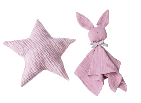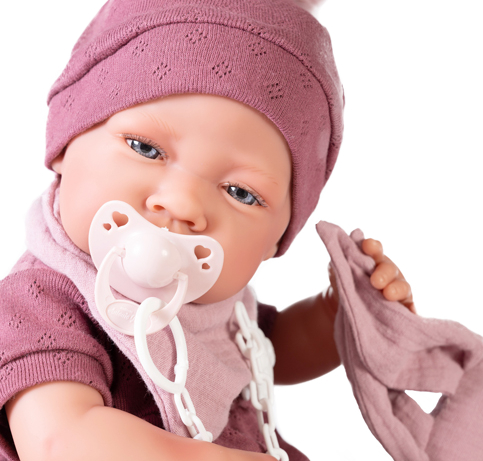 Pięknie wyglądający noworodek ma na sobie wrzosowe śposzki oraz czapkę z pomponem. Uwielbia bawić się poduszką w kształcie gwiazdy, a kiedy robi się senny kładzie się na niej i przytula swojego króliczka dou dou. Komplet uzupełniono również o śliniaczek, skarpetki i smoczek z zawieszką misia. Całą stylizację wykonano z przyjemnego w dotyku towrzywa i z pewnością posłuży jak najdłużej.