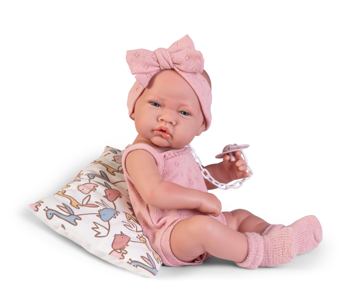 Jedna z najpiękniejszych lalek hiszpańskich z kolekcji Antonio Juan — Recien Nacida 50410 ubrana jest w ręcznie szytą, bawełnianą piżamkę na ramiączkach w modnym odcieniu różu. Dzięki zastosowaniu zapięcia na rzep łatwo jest ją zdjąć. Outfit dopełniają miękkie skarpetki oraz stylowa opaska na głowę. Zabawę urozmaicają akcesoria: smoczek na łańcuszku z klipsem w kształcie misia oraz przytulna poduszka w kolorowe zwierzątka. Oryginalne, designerskie opakowanie z wieczkiem może spełniać rolę łóżeczka dla bobasa. Lalki hiszpańskie Antonio Juan posiadają wszystkie wymagane certyfikaty bezpieczeństwa i nadają wyjątkowego charakteru każdej kolekcji zabawek.