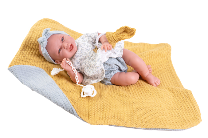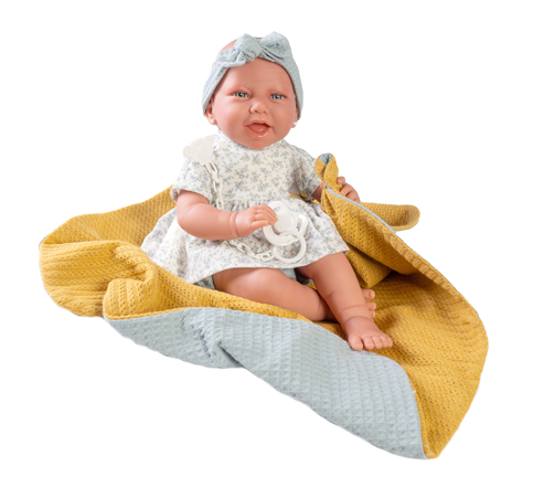 Hiszpańska laleczka ma na sobie kwiecistą kreację na krótki rękaw, a z tyłu ubranka umieszczono zapięcie na rzep. Taki sposób zapięcia pozwoli na łatwiejsze użytkowanie ciuszka. Dopełnieniem zestawu są szare bufiaste majteczki. Producent Antonio Juan wyposażył również komplet w dwustronny kocyk. Warstwa zewnętrzna okrycia jest pikowana, z kolei środek posłania tworzy musztardowa dzianina. Cały komplet ubranek wykonano z przyjemnej w dotyku bawełny organicznej. Dodatkowo producent dołączył gryzak i smoczek z zawieszką misia. Producent z uwagi na bezpieczeństwo dziecka zaleca zabawkę dla dzieci powyżej 3 roku życia.
