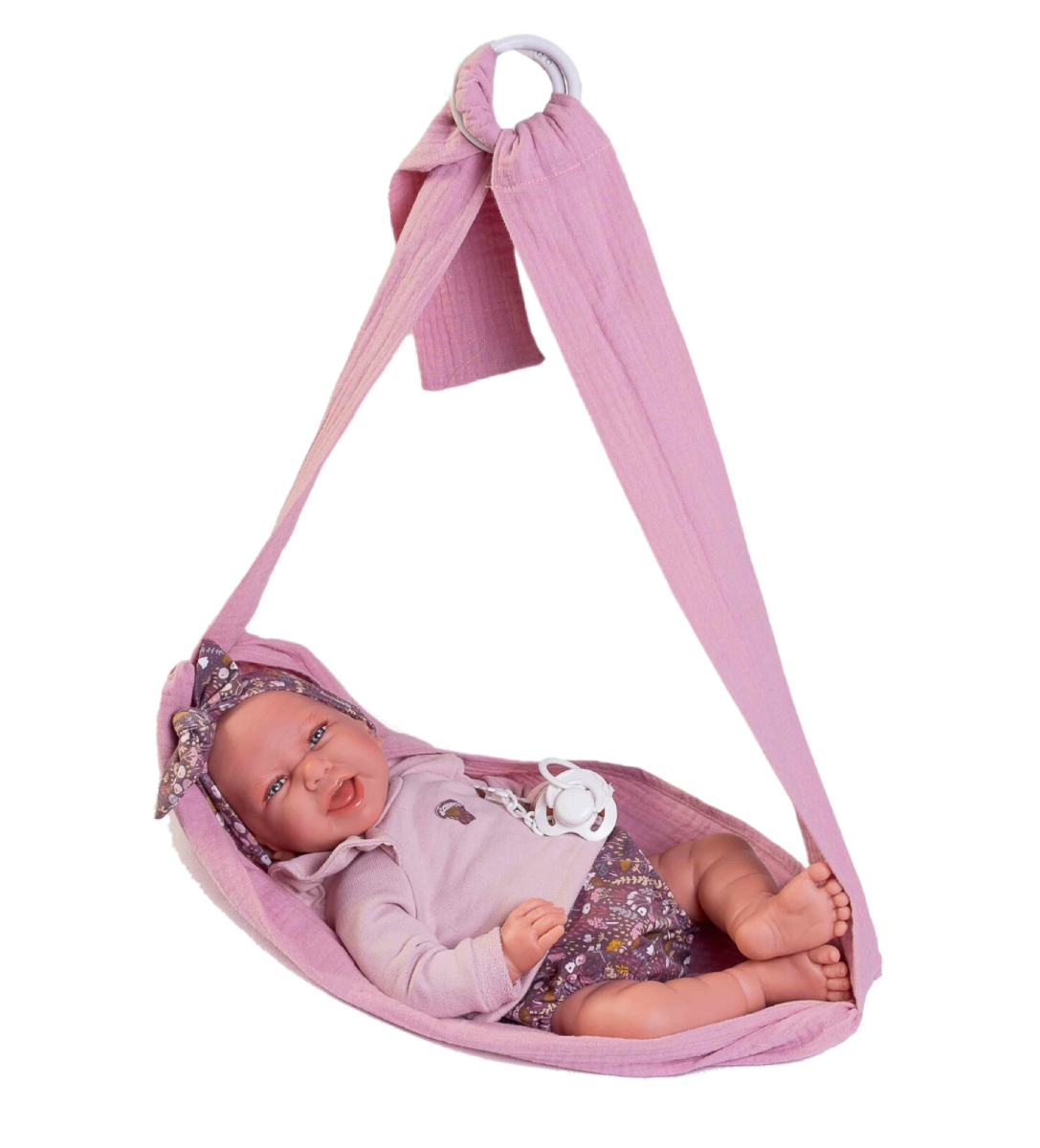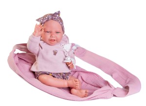 Carla ma na sobie uroczą stylizację, która idealnie pasuje do jej chusty. Dziewczynka z miękkim brzuszkiem ubrana jest w liliową bluzeczkę oraz fioletowe, kwieciste spodenki na gumce. Ubranko przy ramionach ozdobiono falbanką, a na środku umieszczono kwiecistą aplikację. Strój uzupełnia różowa chusta do noszenia lali i smoczek na łańcuszku zakończony przywieszką z misiem. Smok z zawieszką można przypiąć do ubranka, by lala miała go zawsze przy sobie. Z kolei chusta przyda się podczas leżakowania, drzemek bobasa czy spacerów z Carlą. Dokładnie odwzorowana lala będzie towarzyszyła Twojej córeczce na każdym kroku.