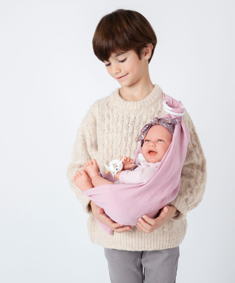 Sprawdź jak roześmiana Recien Nacida Carla 33352 lubi być noszona w chuście. Dziewczynka ma 42 cm wysokości. Antonio Juan powiększa kolekcję lalek hiszpańskich w sam raz do przytulania. Carla ma niebieskie oczy zakończone rzęsami, które są na stałe otwarte, a brwi zostały delikatnie namalowane. Na główce wykonano rzeźbienia, które wyglądają jak krótkie, delikatne włoski noworodka. Dodatkowo dziewczynka ma nałożoną kwiecistą opaskę z kokardą, która sprawia, że jej buzia jest piękna.