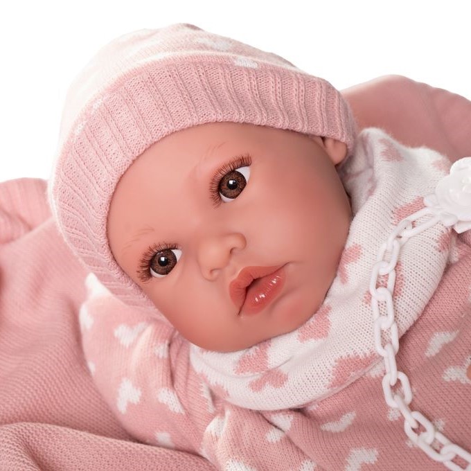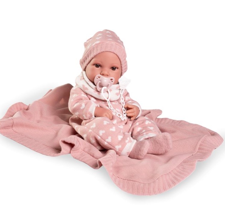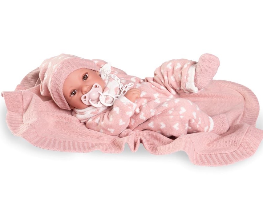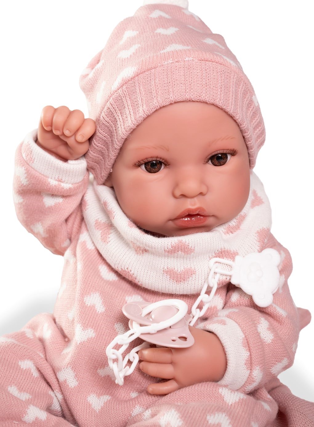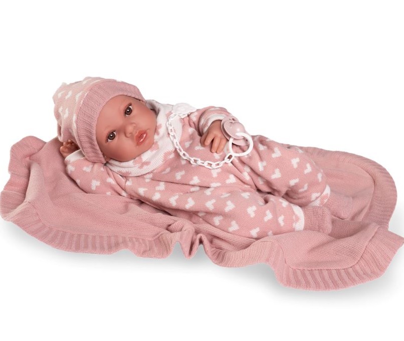 Lalka hiszpańska 50418 marki Antonio Juan to marzenie każdego dziecka, uwielbiającego zabawę w odgrywanie ról. Autentyczny wygląd pozwala z łatwością wcielić się w rolę troskliwego rodzica. Erika ubrana jest w oryginalnie zaprojektowany, ciepły różowy kombinezon w białe serduszka, szaliczek oraz czapeczkę. Zestaw dopełniają skarpetki, kocyk oraz przypinany smoczek na łańcuszku. Strój z łatwością można zdjąć, a bobasa przebrać lub wykąpać.