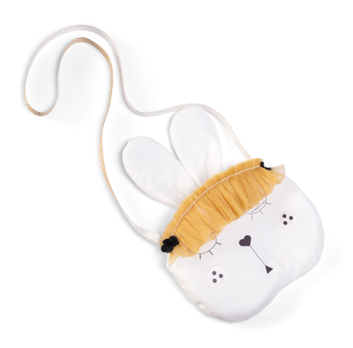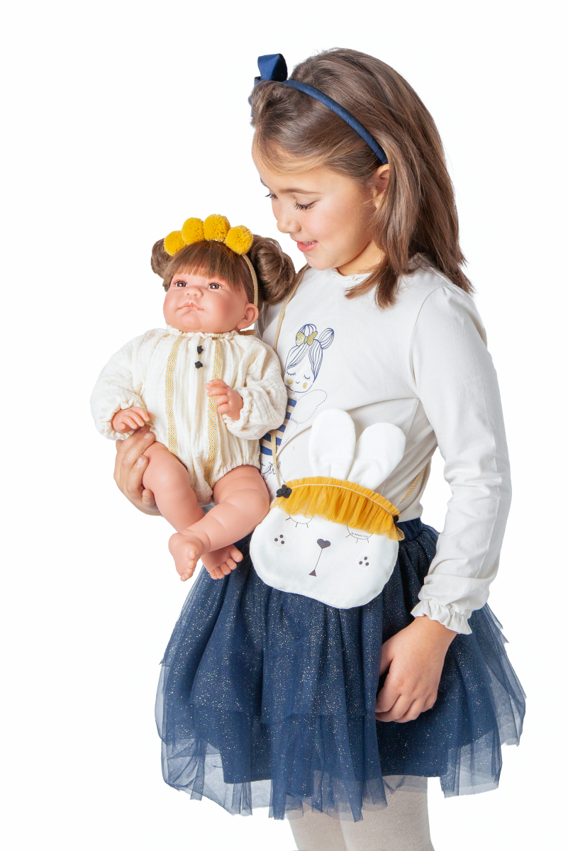 Lalka hiszpańska ma na sobie zapinane na rzep pięknie zaprojektowane bawełniane body zdobione pionowymi paseczkami i pomponikami. Szyku dodaje wiązana opaska z pluszowymi kulkami. Niepowtarzalnym dodatkiem jest ozdobna torebka na ramię, zaprojektowana specjalnie dla małej opiekunki.
