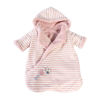 Dziewczynka gotowa do wyjścia, ma na sobie jednolite body zapinane na rzep, a gdy zmarznie można ją włożyć do ciepłego śpiworka z zimowymi rękawkami. Środek śpiworka z kapturem wysłano mięciutkim polarem, a stronę zewnętrzną ozdobiono drobnymi, różowymi paseczkami do której przyszyto kotka. Kiedy Nica będzie chciała wydostać się ze śpiworka możesz założyć dopasowaną czapkę z pomponami, aby było jej ciepło. Materiał z którego wykonano ciuszek jest niezwykle przyjemny w dotyku i z pewnością posłuży jak najdłużej. Całą stylizację dziewczynki uszyto z tkanin z bawełny organicznej, a to oznacza, że do ich produkcji nie zostały użyte środki chemiczne, a jedynie naturalne.