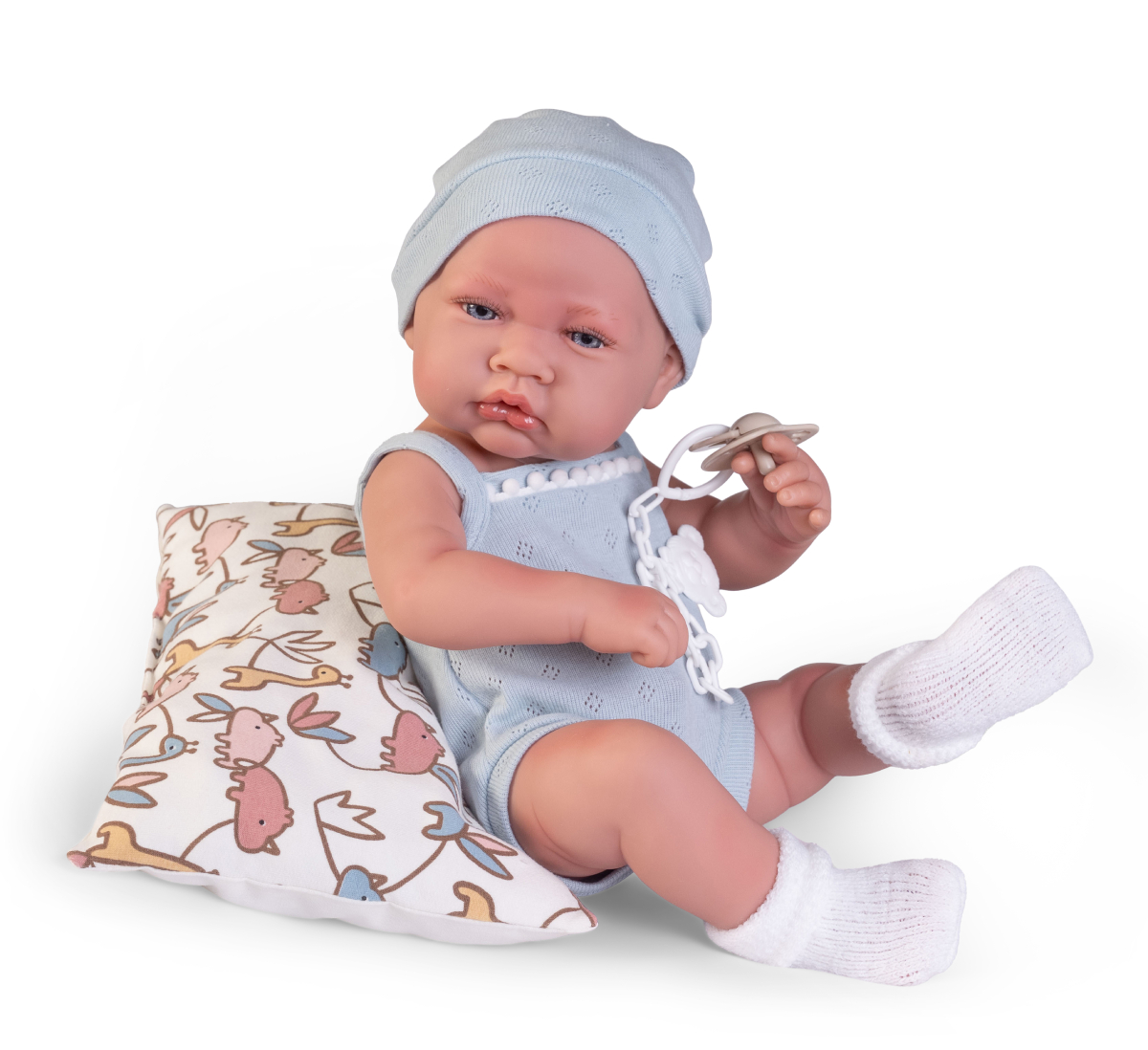 Jedna z najpiękniejszych lalek hiszpańskich z kolekcji Antonio Juan — Recien Nacido 50409 ubrana jest w ręcznie szytą, niebieską, bawełnianą piżamkę na ramiączkach. Dzięki zastosowaniu zapięcia na rzep łatwo jest ją zdjąć. Outfit dopełniają miękkie, białe skarpetki oraz ciepła czapeczka. Zabawę urozmaicają akcesoria: smoczek na łańcuszku z klipsem w kształcie misia oraz przytulna poduszka w kolorowe zwierzątka. Oryginalne, designerskie opakowanie z wieczkiem może spełniać rolę łóżeczka dla bobasa. Lalki hiszpańskie Antonio Juan posiadają wszystkie wymagane certyfikaty bezpieczeństwa i nadają wyjątkowego charakteru każdej kolekcji zabawek.