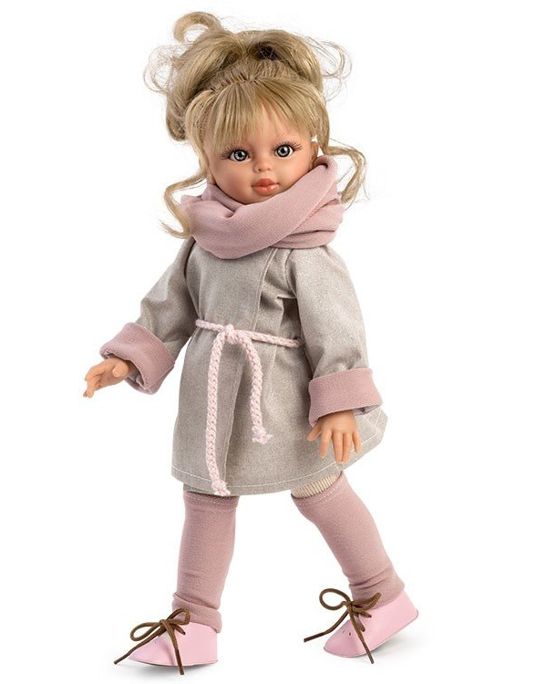 Lalka ma na sobie elegancki, szary płaszczyk wiązany w pasie. Dekorację okrycia stanowią różowe mankiety przy rękawkach. Strój uzupełnia różowy komin wykonany z dzianiny, beżowe rajstopki oraz różowe ocieplacze. Ponadto nóżki dziewczynki zdobią wiązane buciki w kolorze różowym. Wszystkie ubrania dziewczynki można zdjąć, aby umilić zabawę i nabrać wprawy w przebieraniu pociechy. Ubranko uszyto z przyjemnych w dotyku tkanin by zapewnić dziecku komfort zabawy.