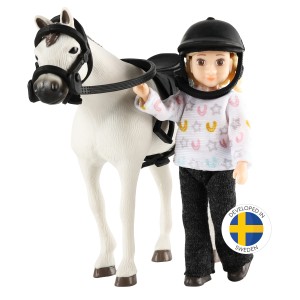 Urocza, realistyczna lalka dżokejka w komplecie z białym koniem idealnie pasuje do domku dla lalek marki Lundby. Zaprojektowany w Szwecji zestaw zawiera uroczą lalkę, białego konia, kask jeździecki, uzdę i siodło. Lalka ma zdejmowane ubranie oraz ruchomą główkę, rączki i nóżki, dzięki czemu można jej nadawać różne pozy. Opakowanie zestawu ma kształt domku dla lalek - zachowaj je by od razu przystąpić do zabawy!