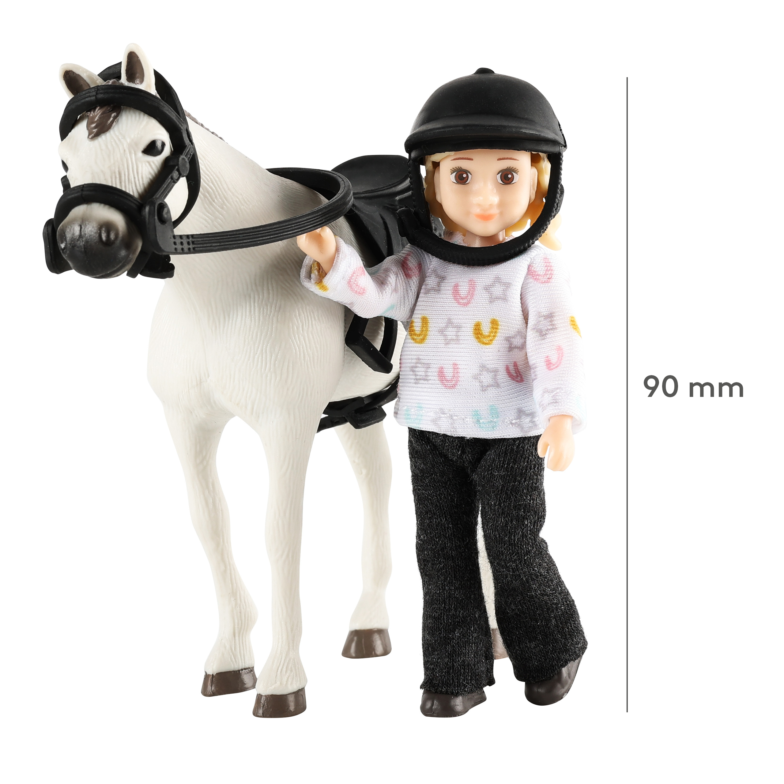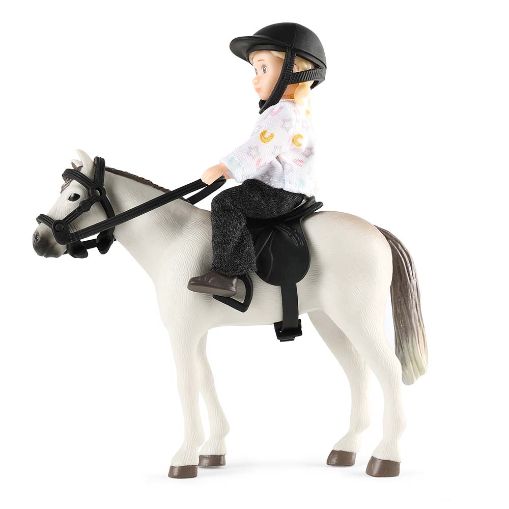 Zabawka zawiera uroczą lalkę, która jest pasjonatką jazdy konnej i jej konia. Piękny biały koń może być osiodłany załączonym czarnym siodłem, jest również uzda i kask jeździecki.