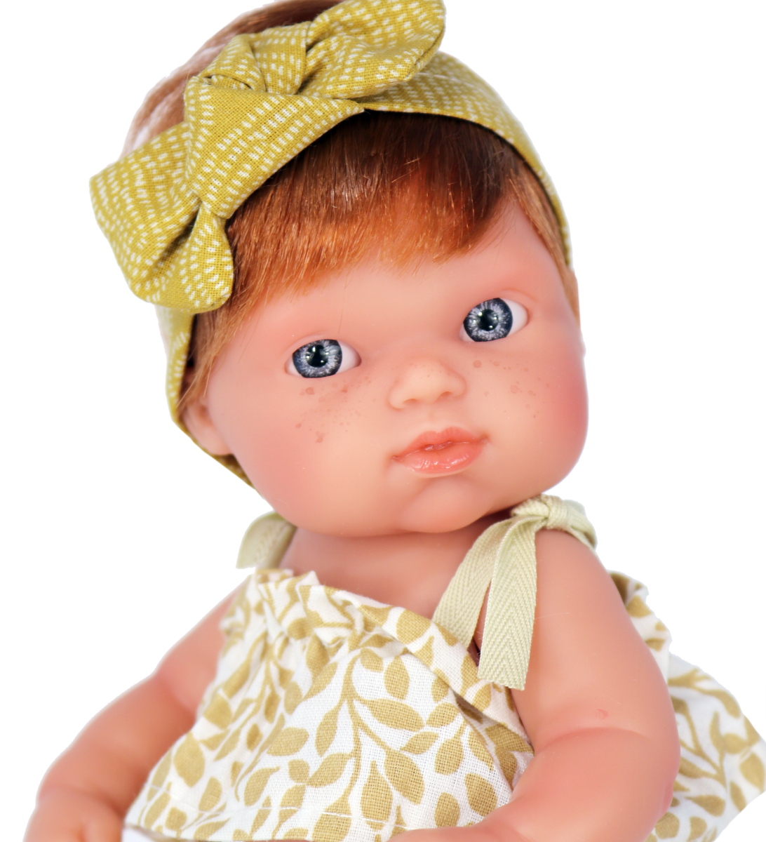 Uroczy bobas z włosami Mufly od firmy Antonio Juan to niewielka laleczka o wysokości 21 cm. Dziewczynka ma krótkie miedziane włoski z grzywką. Uroku dodają jej duże, niebieskie oczka, pojedyncze piegi, błyszczące usta i zaróżowione policzki. Oczy zostały namalowane ręcznie i nie zamykają się. Lalka w najmniejszym detalu została odwzorowana jak prawdziwa dziewczynka. Dodatkowo Mufly ma zaznaczoną płeć. Zabawka ze względów bezpieczeństwa przeznaczona jest do zabawy dla dzieci od 2 roku życia.
