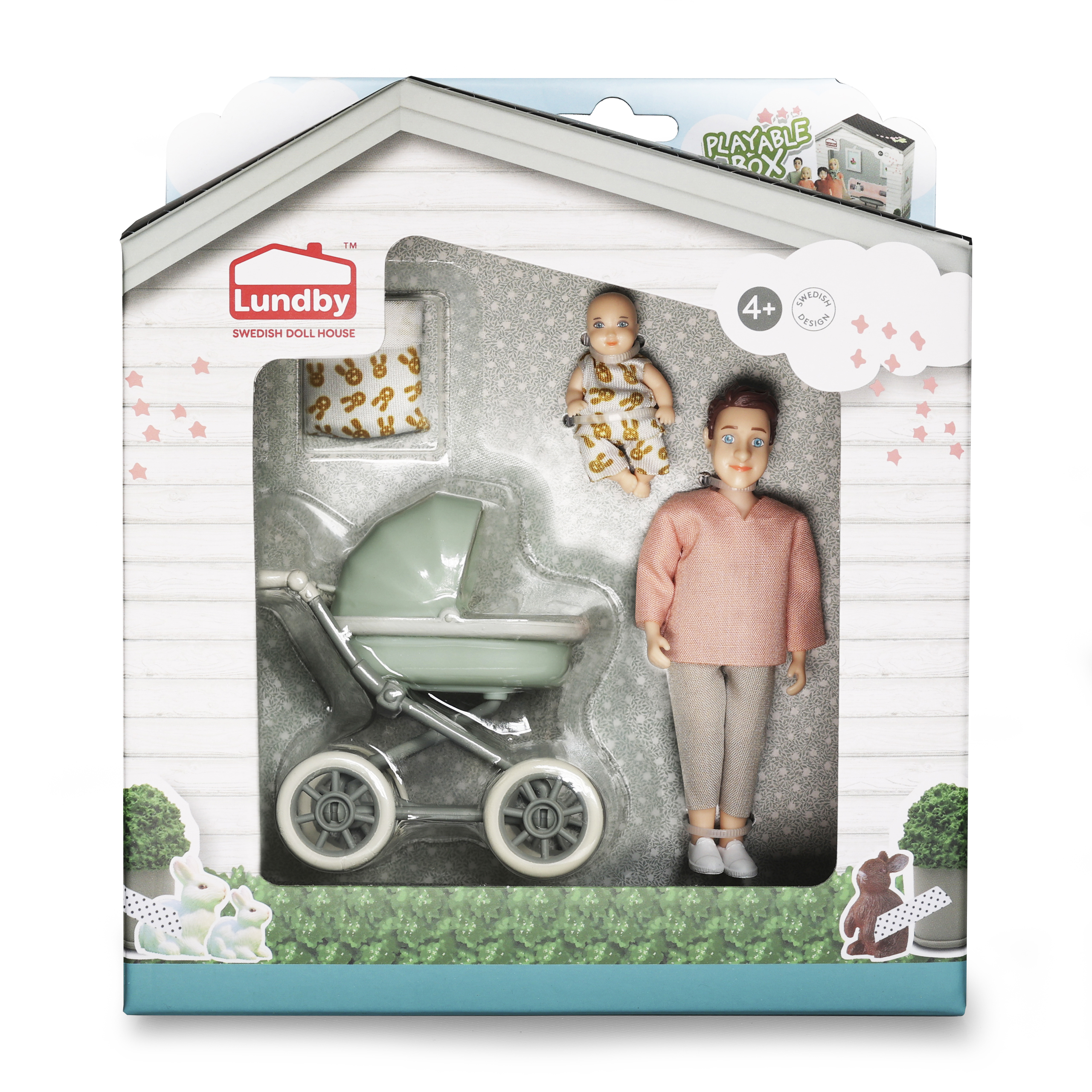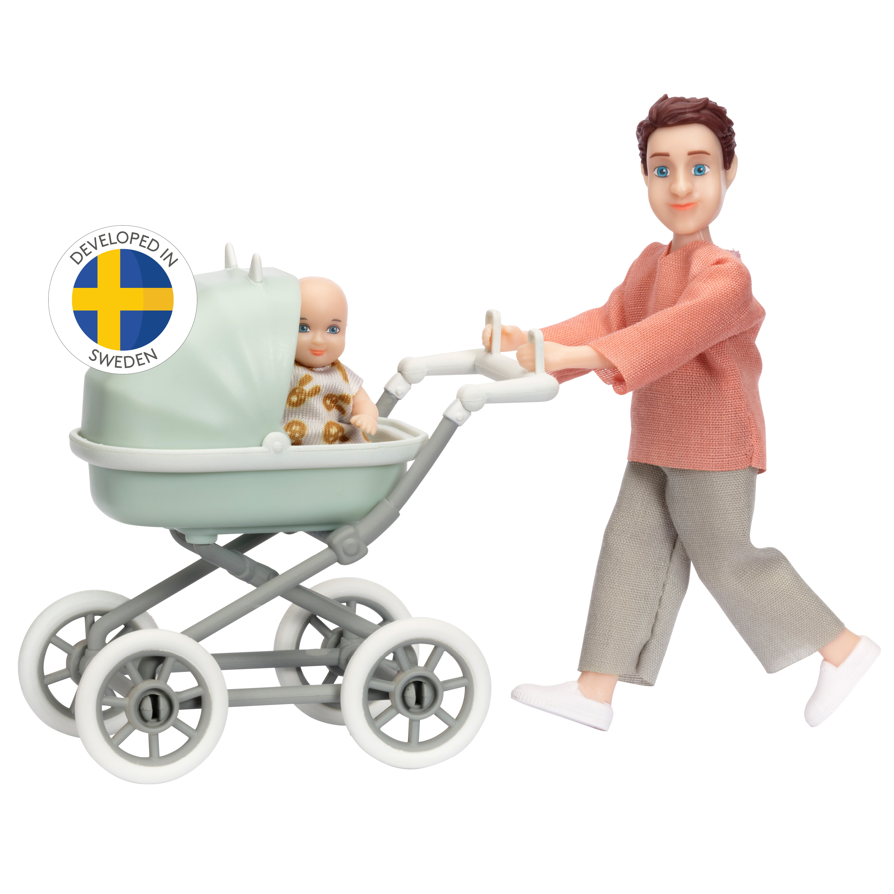 Urocza, realistyczna lalka mężczyzna z niemowlęciem w wózeczku idealnie pasuje do domku dla lalek marki Lundby. Zaprojektowany w Szwecji zestaw zawiera 2 lalki - tatę i słodkiego dzidziusia, śpiworek i wózek głęboki w kolorze miętowym. Lalki mają zdejmowane ubrania oraz ruchome główki, rączki i nóżki, dzięki czemu można im nadawać różne pozy. Opakowanie zestawu ma kształt domku dla lalek - zachowaj je by od razu przystąpić do zabawy!