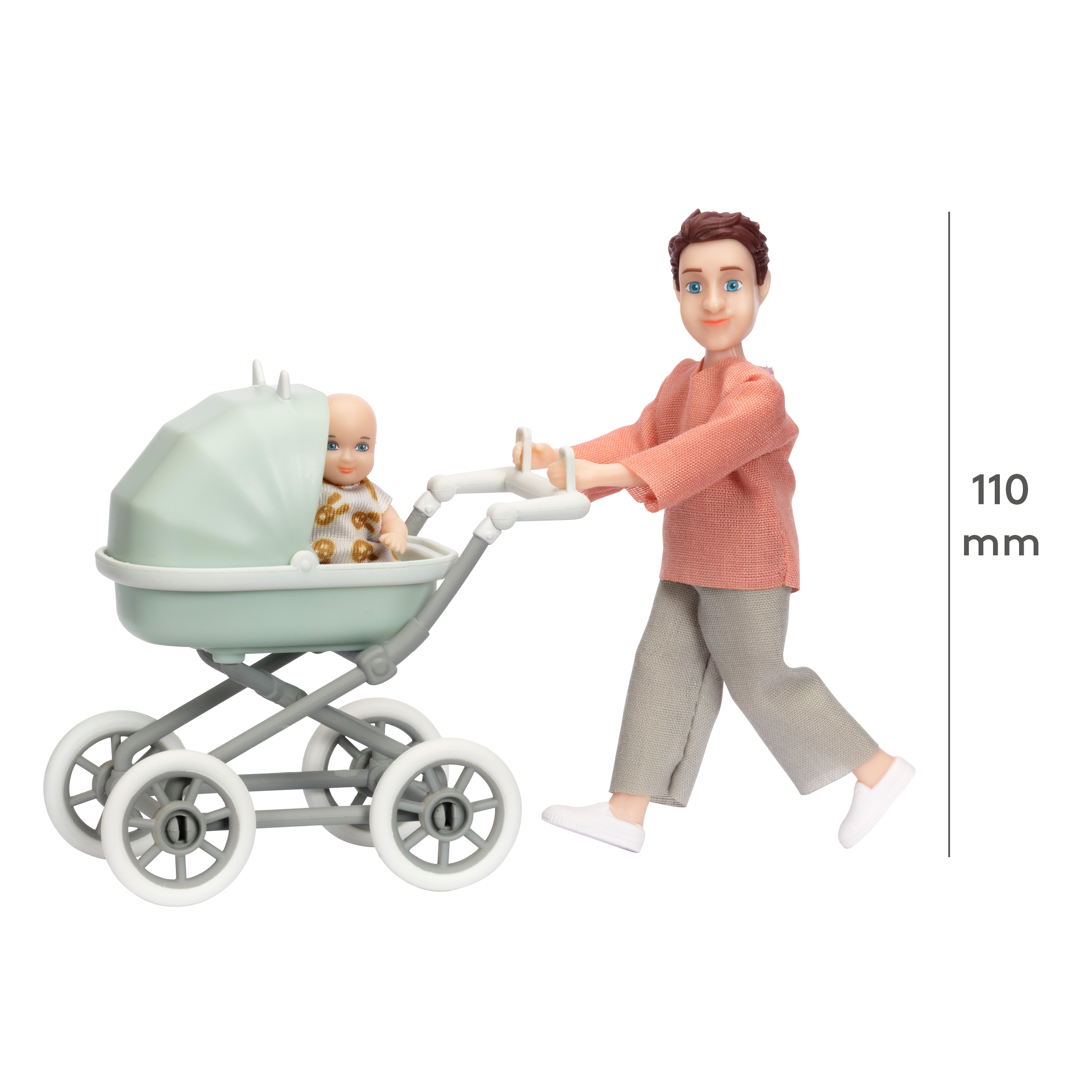Lalka tata mężczyzna z dzieckiem i wózkiem zestaw, zabawka akcesoria Lundby
