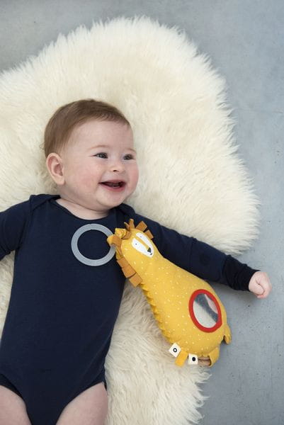 Zawieszka z lusterkiem na brzuszku to miękka i miła w dotyku zabawka, która pobudza wyobraźnie każdego maluszka. Pozwala odkrywać kolory, dźwięki, tekstury i przyglądać się sobie w mini lusterku. Kontrastowe kolory stymulują zmysł wzrok, różnego rodzaju tekstury materiałów i wystające elementy zmysł dotyku, a intrygująca dźwiękiem grzechotka zmysł słuchu. Można ją przymocować do łóżeczka, nosidełka, wózka lub pałąka fotelika samochodowego.