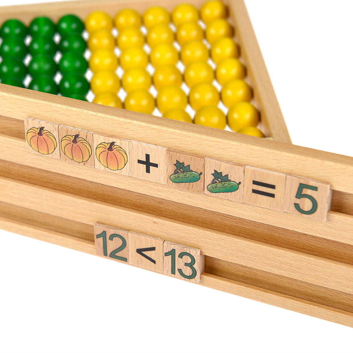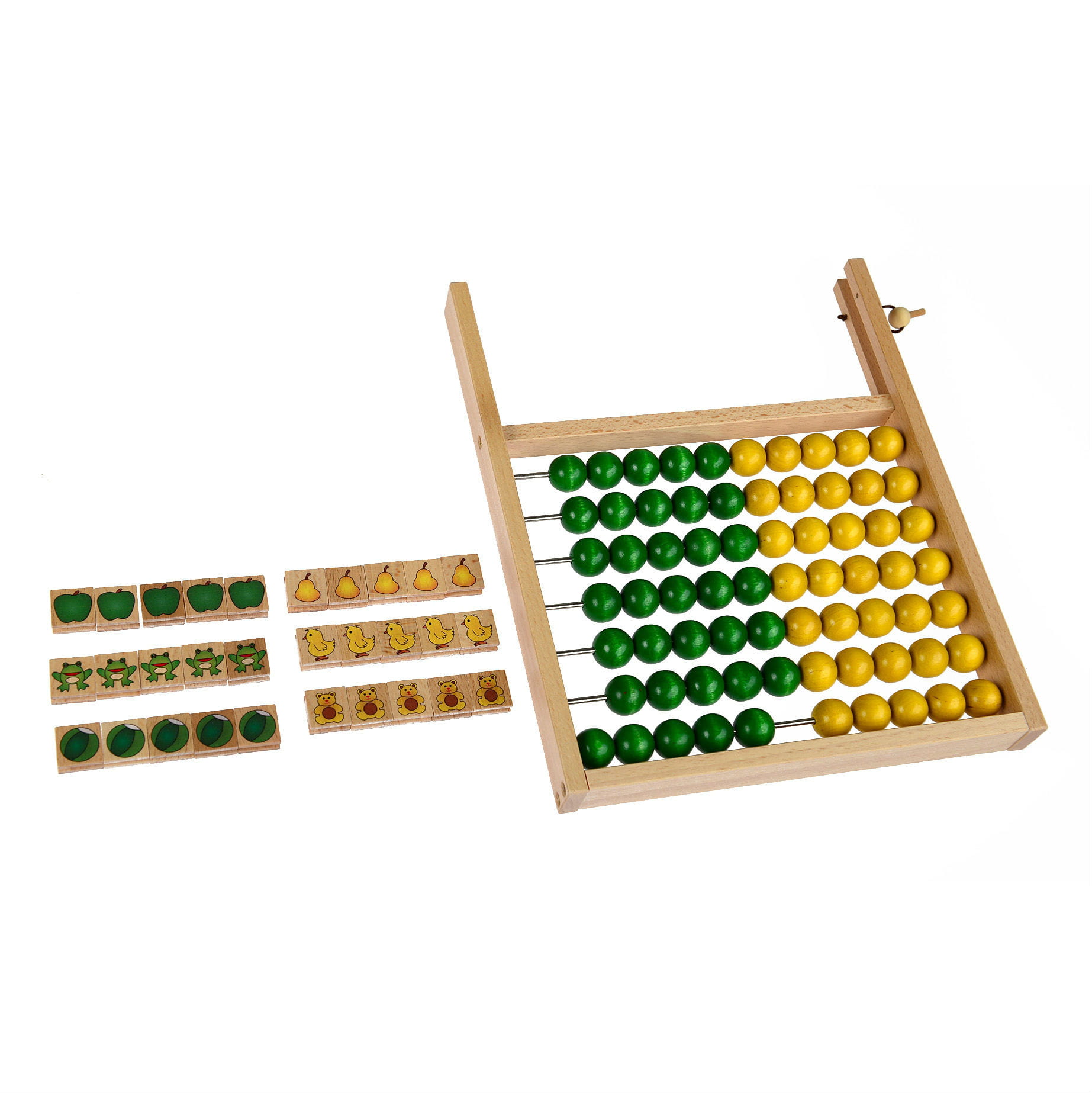 W trzech pierwszych rzędach umieszczono 33 dwustronnie zadrukowane kostki z obrazkami, przedstawiającymi kilka kategorii: zabawki, owoce, warzywa, zwierzęta oraz symbole i znaki matematyczne.