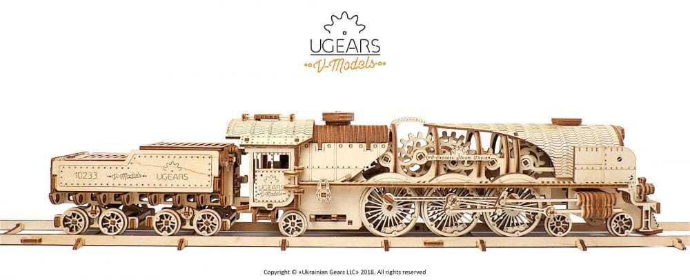 Lokomotywa V-ekspres wraz z tenderem do przewozu węgla od Ugears to wzorowany na XIX-wiecznym parowozie model z silnikiem gumowym. Jest w stanie przejechać nawet do 4 metrów i zachwycać obserwatorów asynchronicznym ruchem najważniejszych części konstrukcji: tłoków, zaworów czy prętów przy kołach.