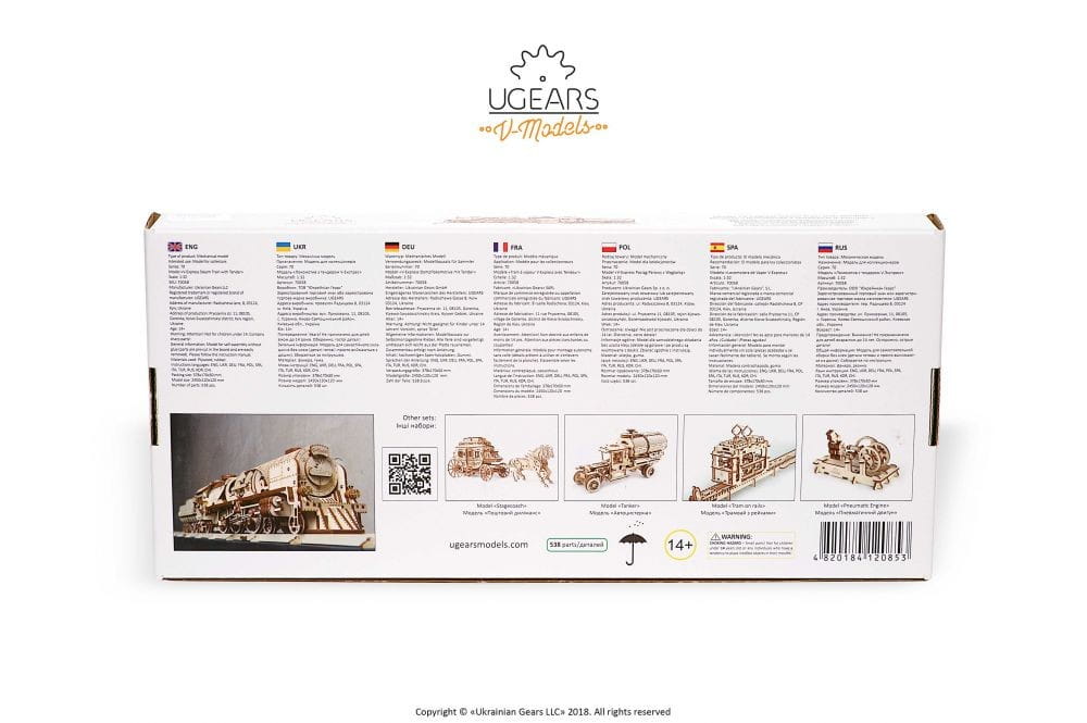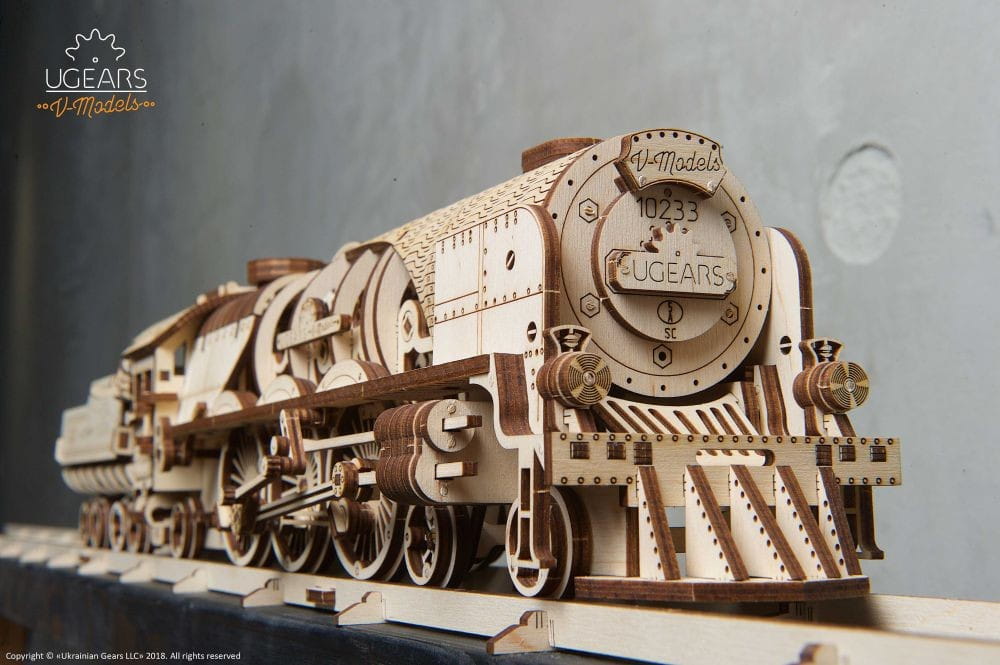 Lokomotywa V-ekspres wraz z tenderem do przewozu węgla od Ugears to wzorowany na XIX-wiecznym parowozie model z silnikiem gumowym. Jest w stanie przejechać nawet do 4 metrów i zachwycać obserwatorów asynchronicznym ruchem najważniejszych części konstrukcji: tłoków, zaworów czy prętów przy kołach. Wykonane z dbałością o szczegóły drewniane puzzle mechaniczne 3D, 538 elementów - poziom trudności: ciężko.