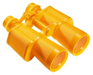 Żółta lornetka dla dzieci. Mała, poręczna, z wygonym pojemnikiem.