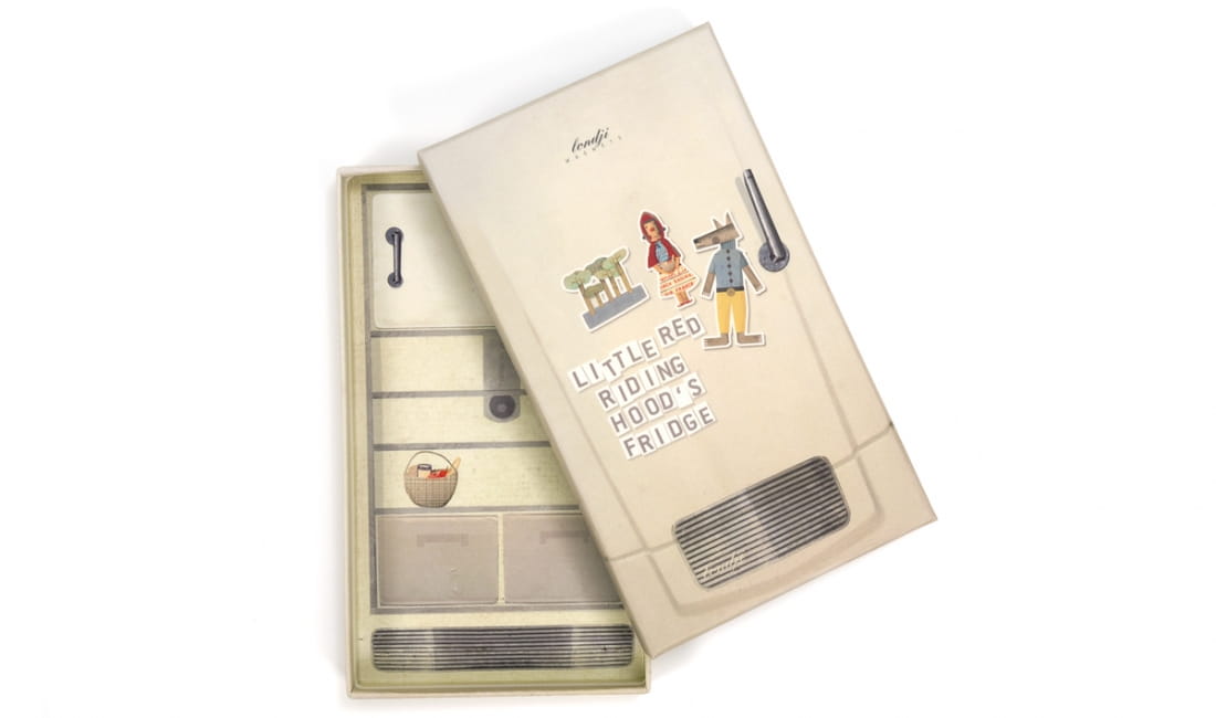 Komplet pięknie ilustrowanych magnesów znajduje się w kartonikowym pudełku stylizowanym na lodówkę.