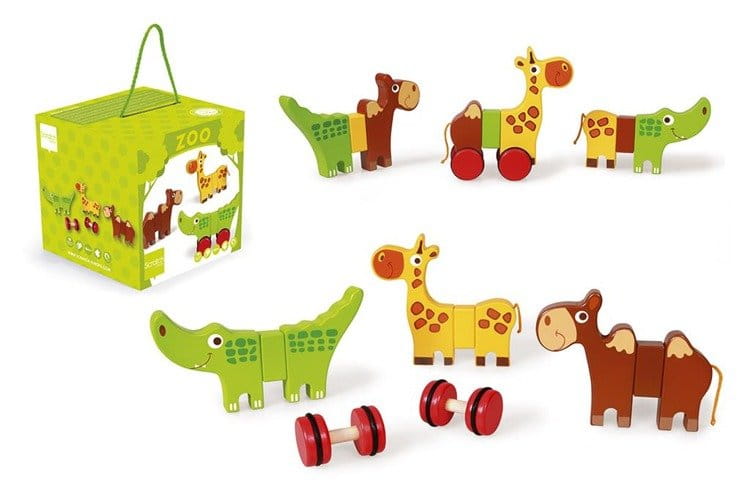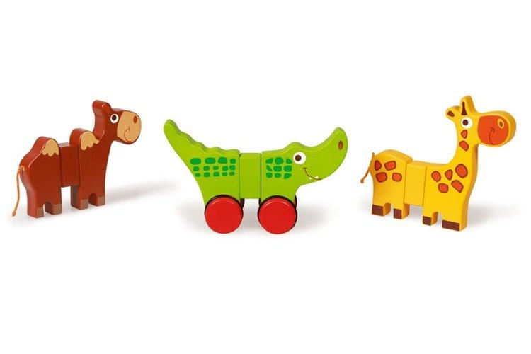 Komplet 3 drewnianych zwierzątek, które można zobaczyć podczas safari: żyrafa, wielbłąd i krokodyl łączonych za pomocą magnesów marki Scratch.