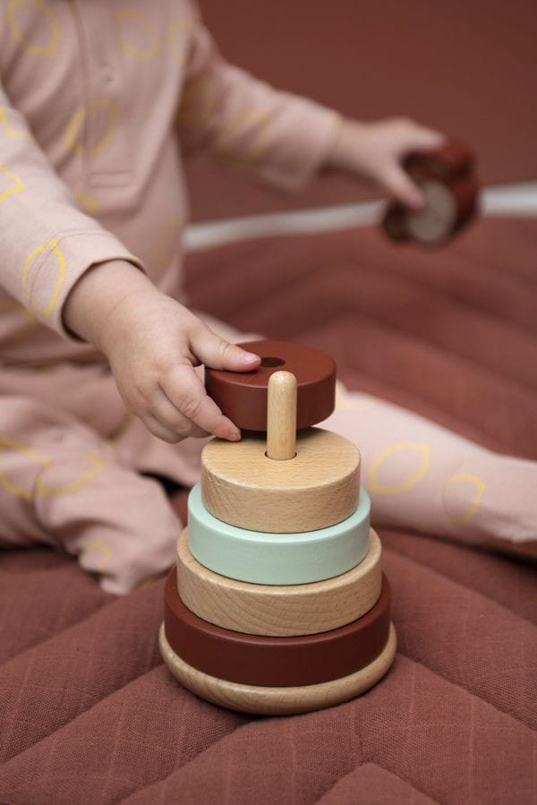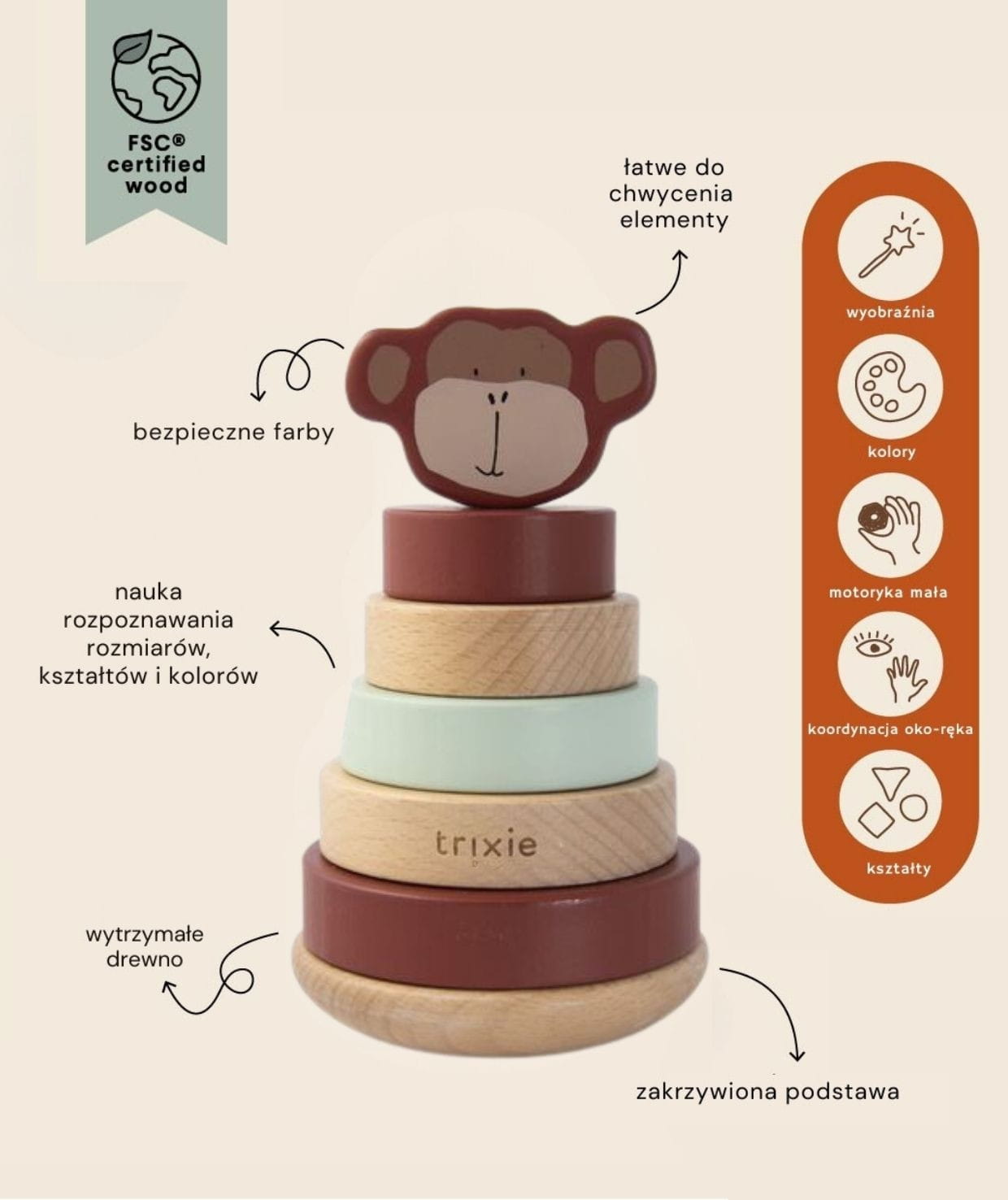 Piramida z krążków o różnej wielkości to klasyczna zabawka, zachwycają prostotą, a jednocześnie pobudzają kreatywność, oferując przy tym przyjemnie spędzony czas. Maluch musi kierować się spostrzegawczością i umiejętnością myślenia logicznego, aby ułożyć kółka wielkością od największego do najmniejszego. Zabawka jest wykonana z wysokiej jakości drewna bukowego w 100% z certyfikatem FSC©. Wszystkie farby na tym produkcie są na bazie wody.