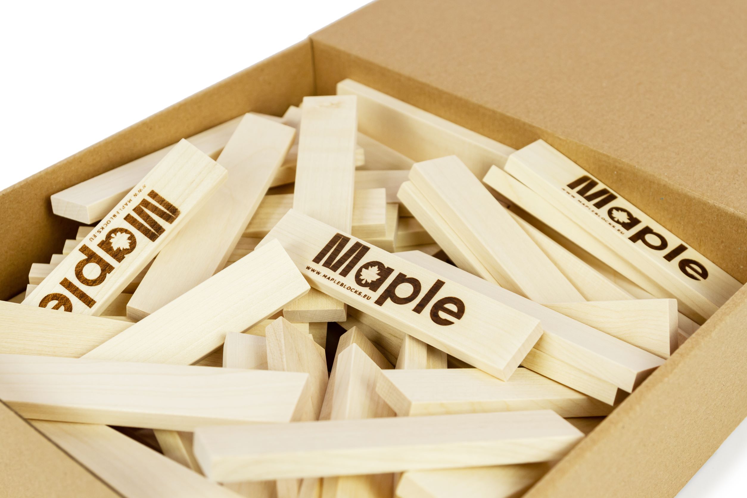 Klocki wykonane są z naturalnego, trwałego, lekkiego i wytrzymałego Klonu.