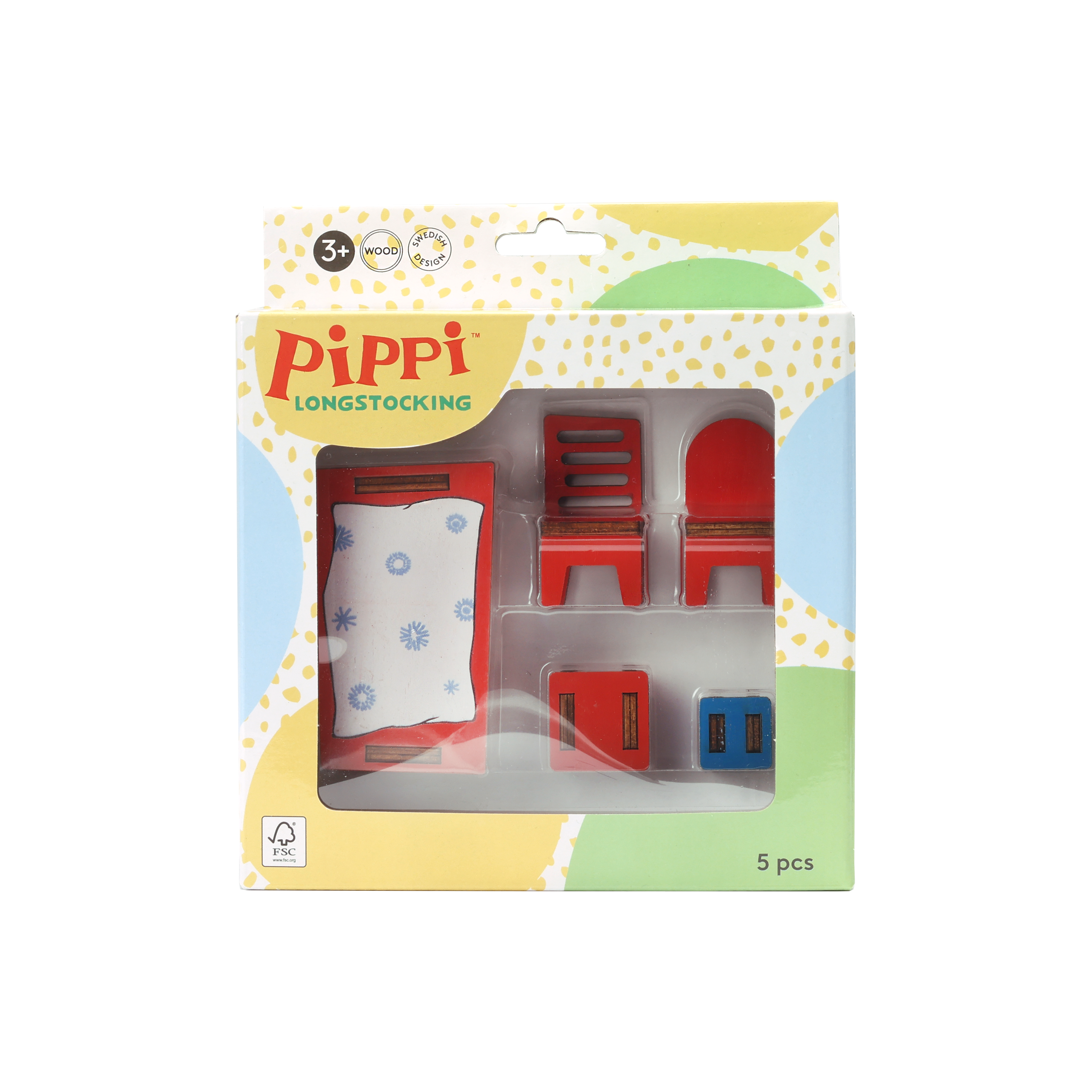 Kolorowy, drewniany zestaw zawiera stół z nadrukowanym obrusem, dwa różne krzesła i dwa różne stołki. Mebelki zostały zaprojektowane w Szwecji i starannie wykonane z drewna ze zrównoważonych zasobów FSC z odwzorowaniem oryginalnych ilustracji z książek o perypetiach Pippi Langstrumpf.
