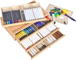 Drewniana kasetka marki Meeden z 4 szufladkami do przechowywania przyborów rysunkowych. Wszystkie szufladki podzielone.