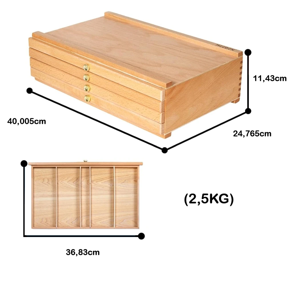 Wykonane z drewna bukowego i wyposażone w połączenia na mikrowczepy, to pudełko na przybory artystyczne jest niezwykle wytrzymałe, a jednocześnie stylowe dzięki naturalnemu odcieniu drewna. Wyrafinowane metalowe uchwyty i ręcznie szlifowane powierzchnie sprawiają, że pudełko to stanowi piękny dodatek do każdego domowego studia.