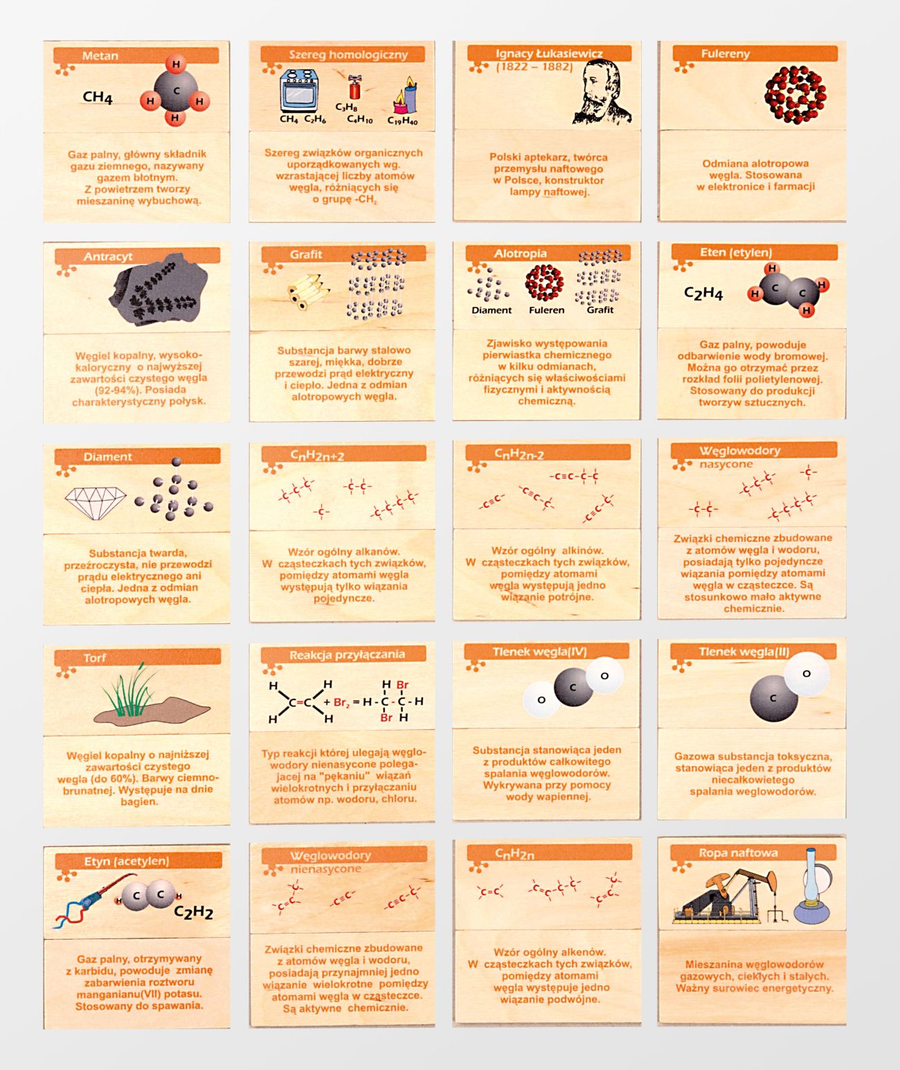 Memory to gra, w której liczy się dobra pamięć, ale wiedza chemiczna też się przyda. Memory chemiczne to zestaw 40 kafelków, na jednym jest hasło i rysunek je ilustrujący, a na jego parze znajduje się definicja. Odszukując pary kafelków uczeń utrwali sobie aż 20 pojęć z dziedziny chemii.