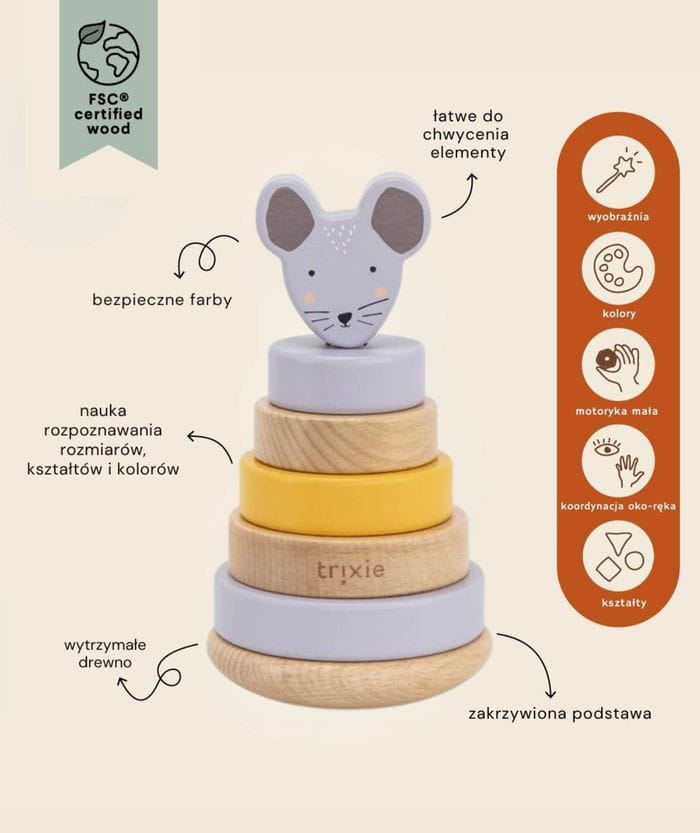 Piramida z krążków o różnej wielkości to klasyczna zabawka, zachwycają prostotą, a jednocześnie pobudzają kreatywność, oferując przy tym przyjemnie spędzony czas. Maluch musi kierować się spostrzegawczością i umiejętnością myślenia logicznego, aby ułożyć kółka wielkością od największego do najmniejszego. Zabawka jest wykonana z wysokiej jakości drewna bukowego w 100% z certyfikatem FSC©. Wszystkie farby na tym produkcie są na bazie wody.